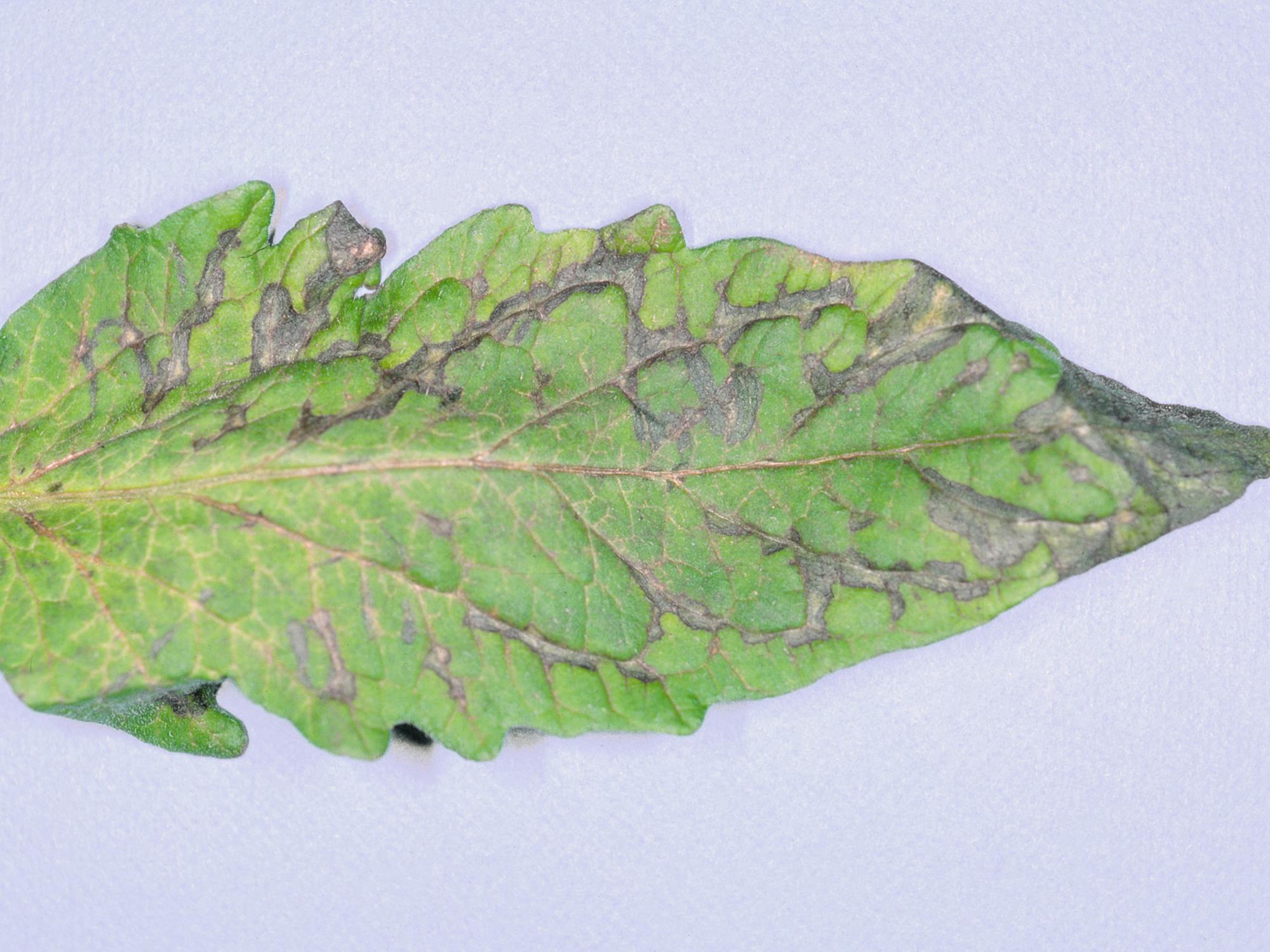 Légende: Brunissement longeant les nervures sur foliole de tomate