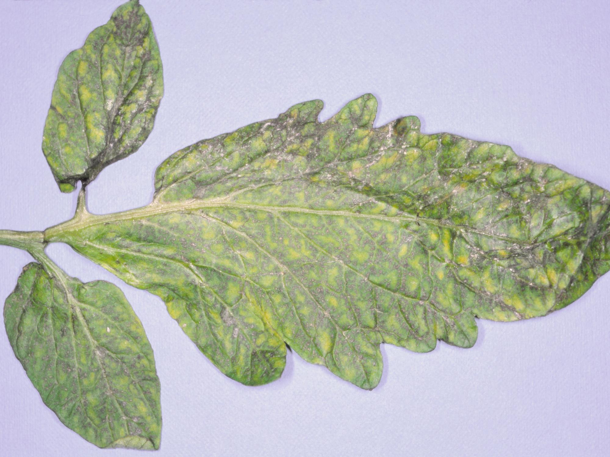 Légende: Brunissement longeant les nervures sur folioles de tomate