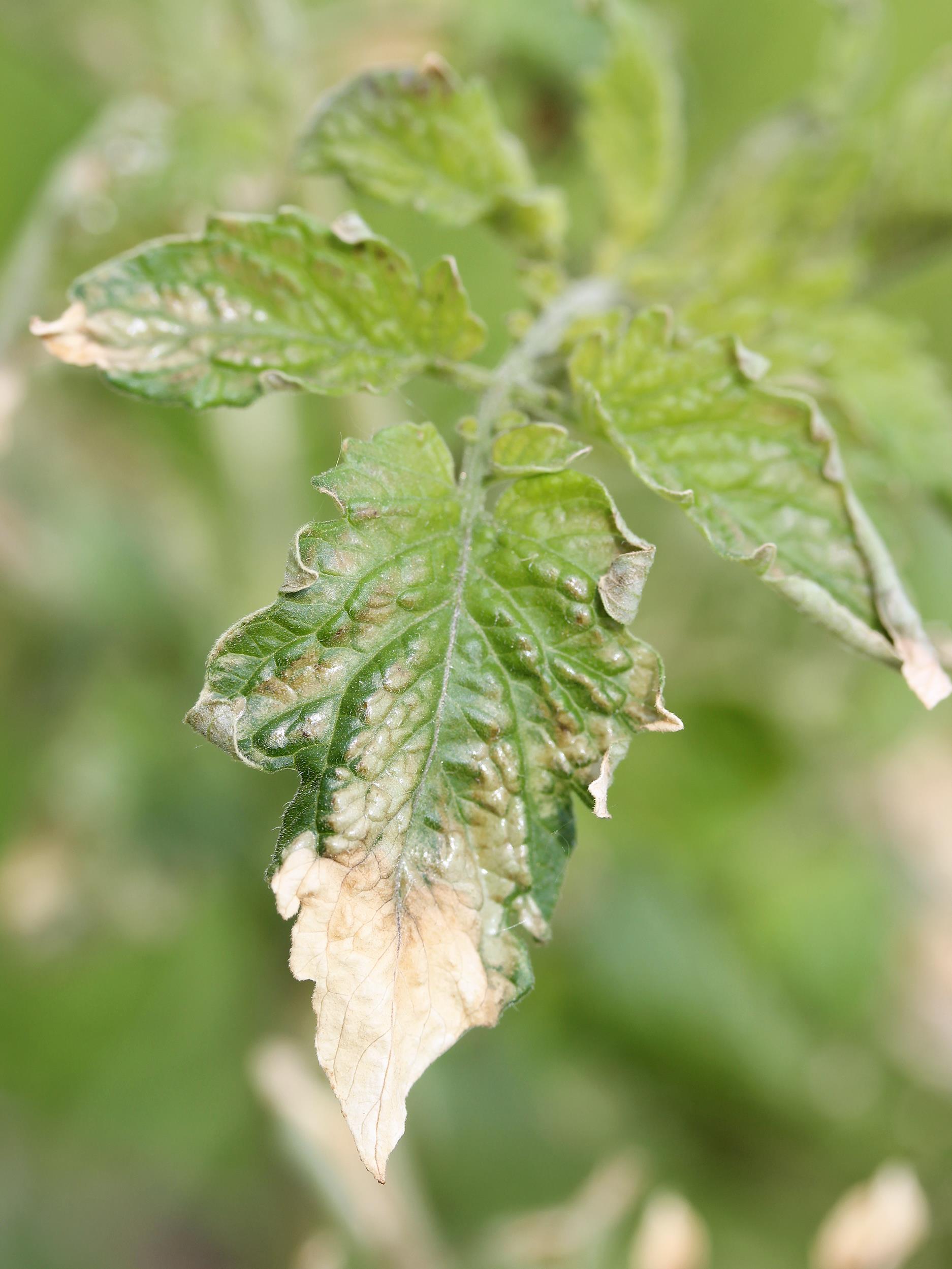 Description: Ces folioles de tomate de champ montrent un blanchiment et un brunissement discret du limbe. Tous les niveaux de feuilles étaient touchés. Ces symptômes sont attribuables à du gel printanier survenu au début du mois de juin.