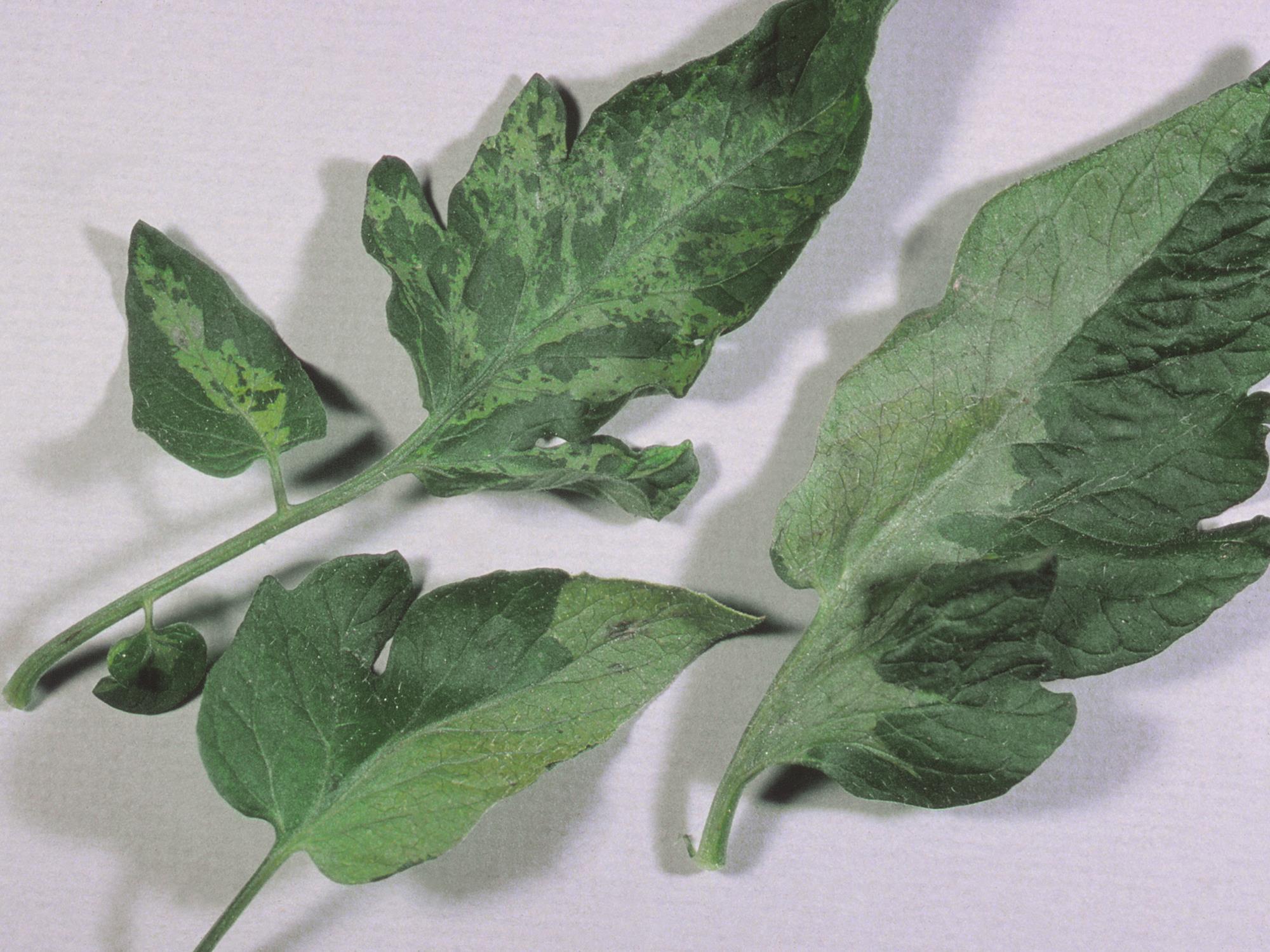 Description: Les folioles de tomate de serre montrent de grandes plages vert grisâtre occupant presque la moitié du limbe et dont la marge est bien délimitée des tissus sains. Ce symptôme est caractéristique d’un désordre génétique appelé argenture.