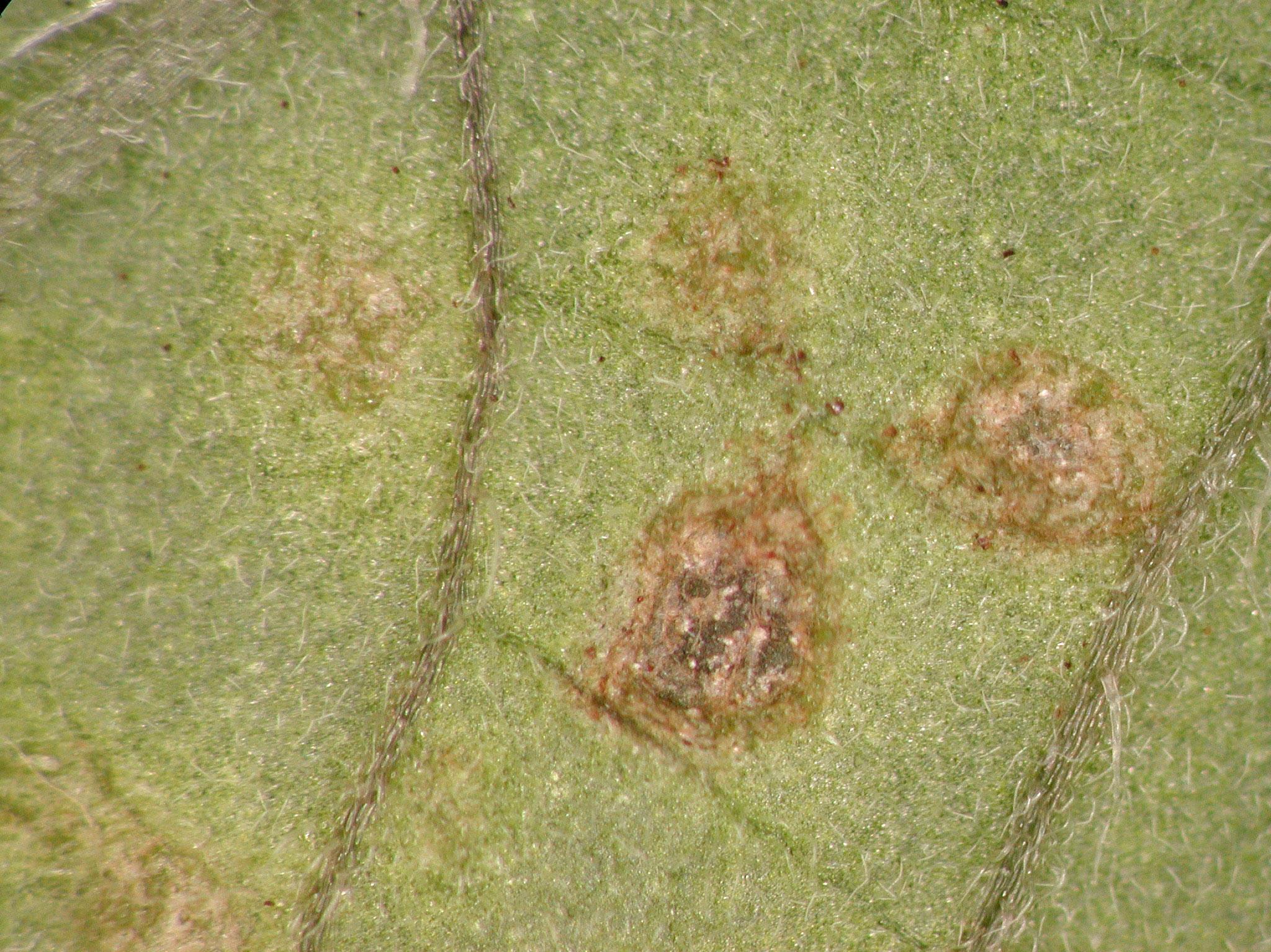 Description: Une vue rapprochée de la face inférieure d’une foliole de tomate de serre permet de noter la présence de protubérances brunes. Les feuilles basales et médianes sont les plus affectées. Les feuilles présentaient à la face supérieure des taches circulaires ayant au début une coloration uniforme jaune et dont le centre est devenu brun par la suite. Les taches pouvaient se réunir pour former des taches irrégulières ayant une plus grande surface ou des brûlures par la suite (non visible ici). Ces symptômes sont caractéristiques de l’œdème. Tous les plants de la serre étaient porteurs de ces symptômes.