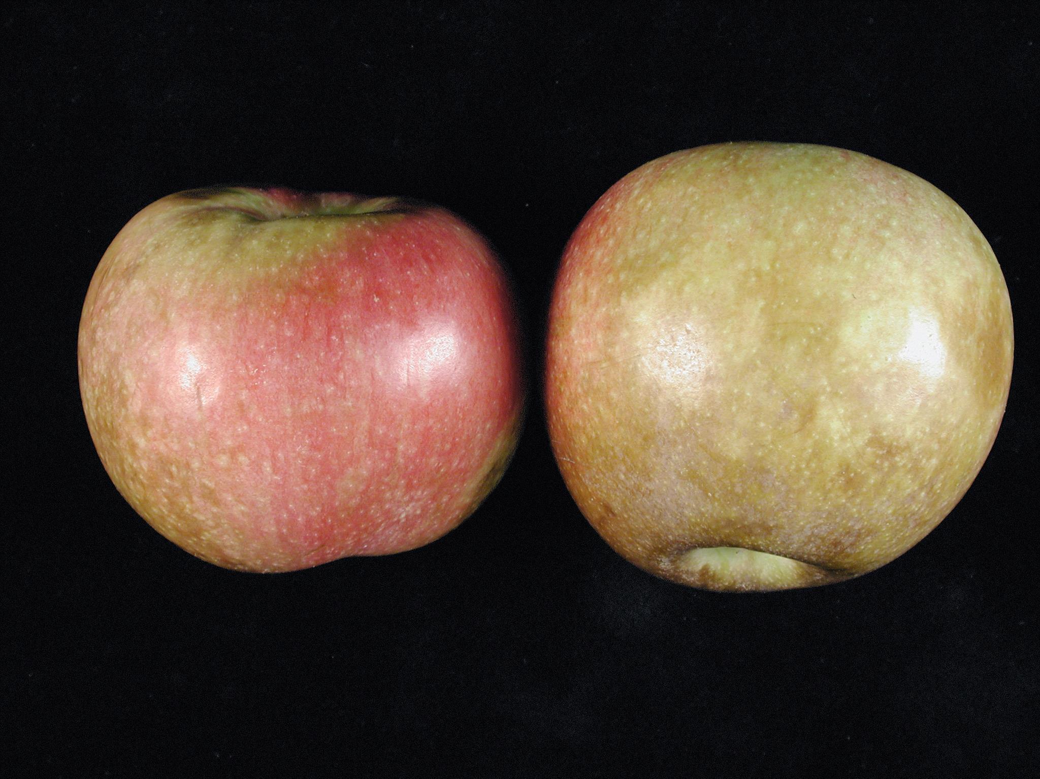 Description: L’épiderme des pommes (cv 'McIntosh') montre un brunissement irrégulier et diffus débutant dans la région de la zone stylaire et progressant vers la zone pédonculaire. La chair est peu ou pas affectée (non visible ici). Aucun agent pathogène n’a été détecté des dommages. Les symptômes s’apparentent à ceux de l’échaudure, car le brunissement est irrégulier et diffus, localisé principalement sur la partie non rougie du fruit et ne pénètre pas ou très peu dans la chair. Les symptômes sont apparus graduellement (plus de 48 heures) à la suite de la sortie des pommes de l’entrepôt.
