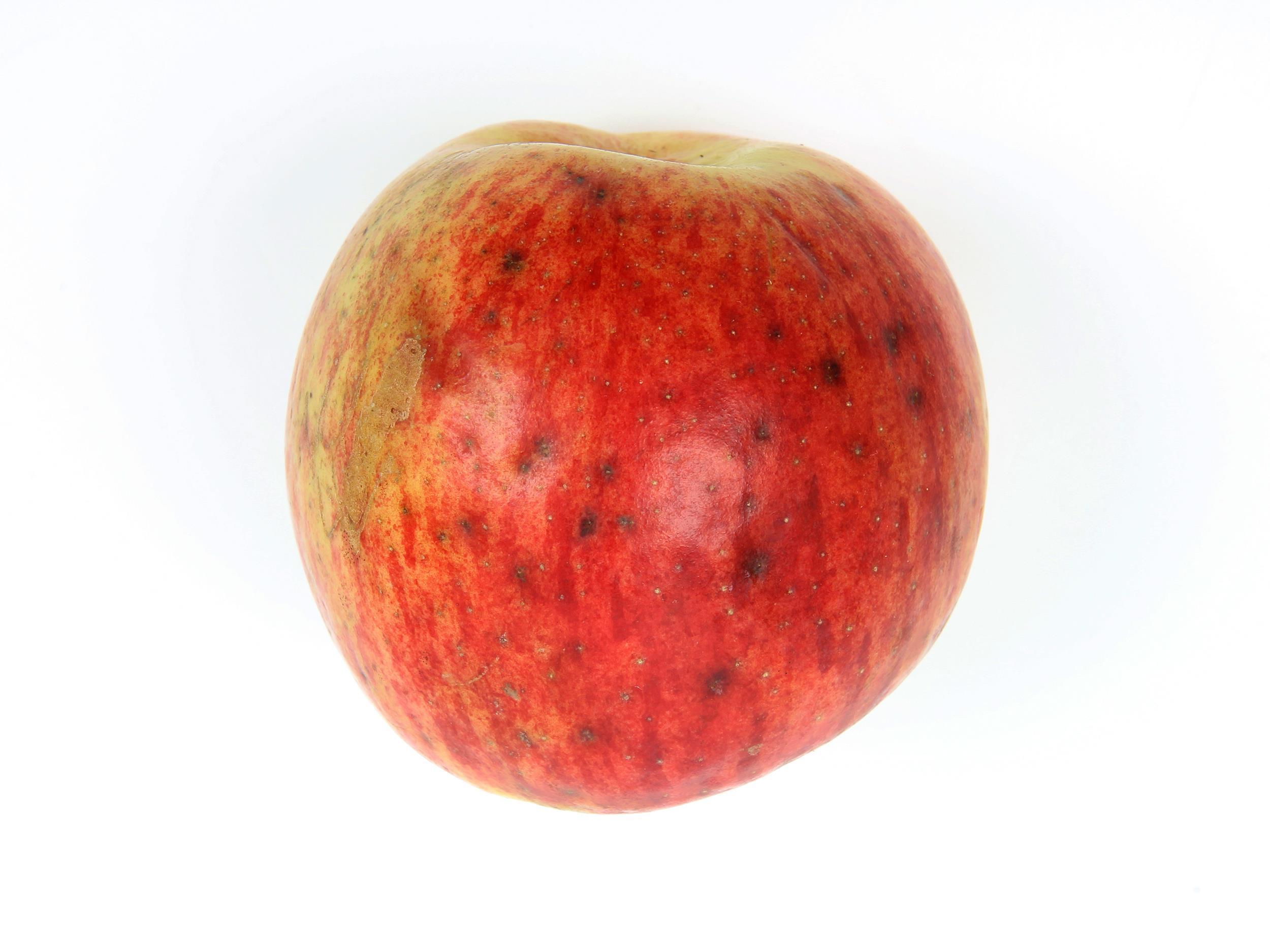 Description: Une pomme (cv 'Cortland') provenant du verger montre de petites taches noires superficielles, légèrement déprimées et localisées au niveau des lenticelles. Elles sont présentes uniquement sur la face de la pomme exposée au soleil. Aucun agent pathogène n’a été détecté des taches. Ce symptôme est caractéristique de la dégradation des lenticelles (ponctuation lenticellaire) observée en prérécolte. La conseillère agricole mentionne que plus de 50 % des fruits des variétés 'Cortland' et 'Honeycrisp' d’un bloc sont affectés.