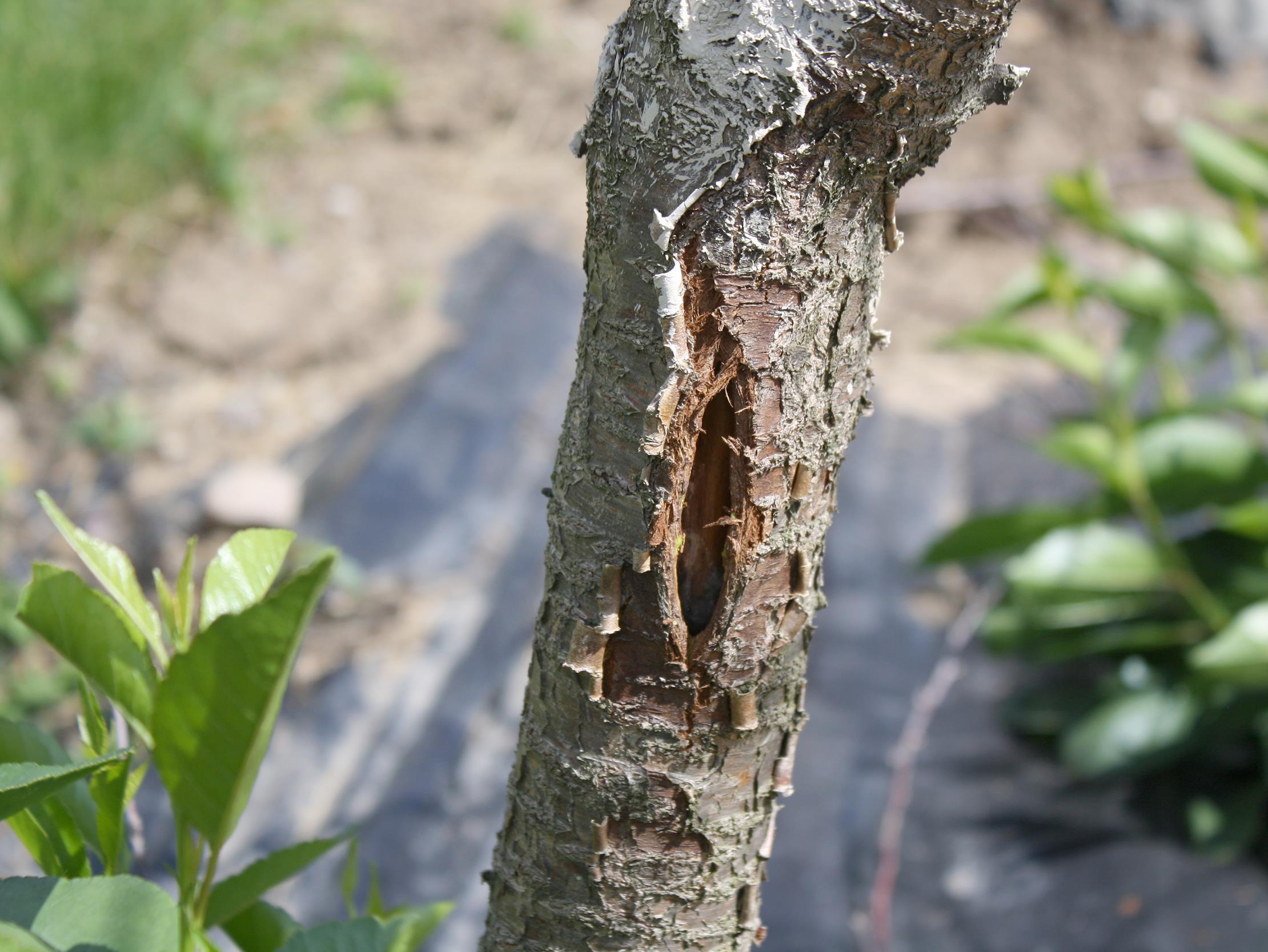 : Début de fendillement dû au gel hivernal sur un tronc de cerisier nain rustique.