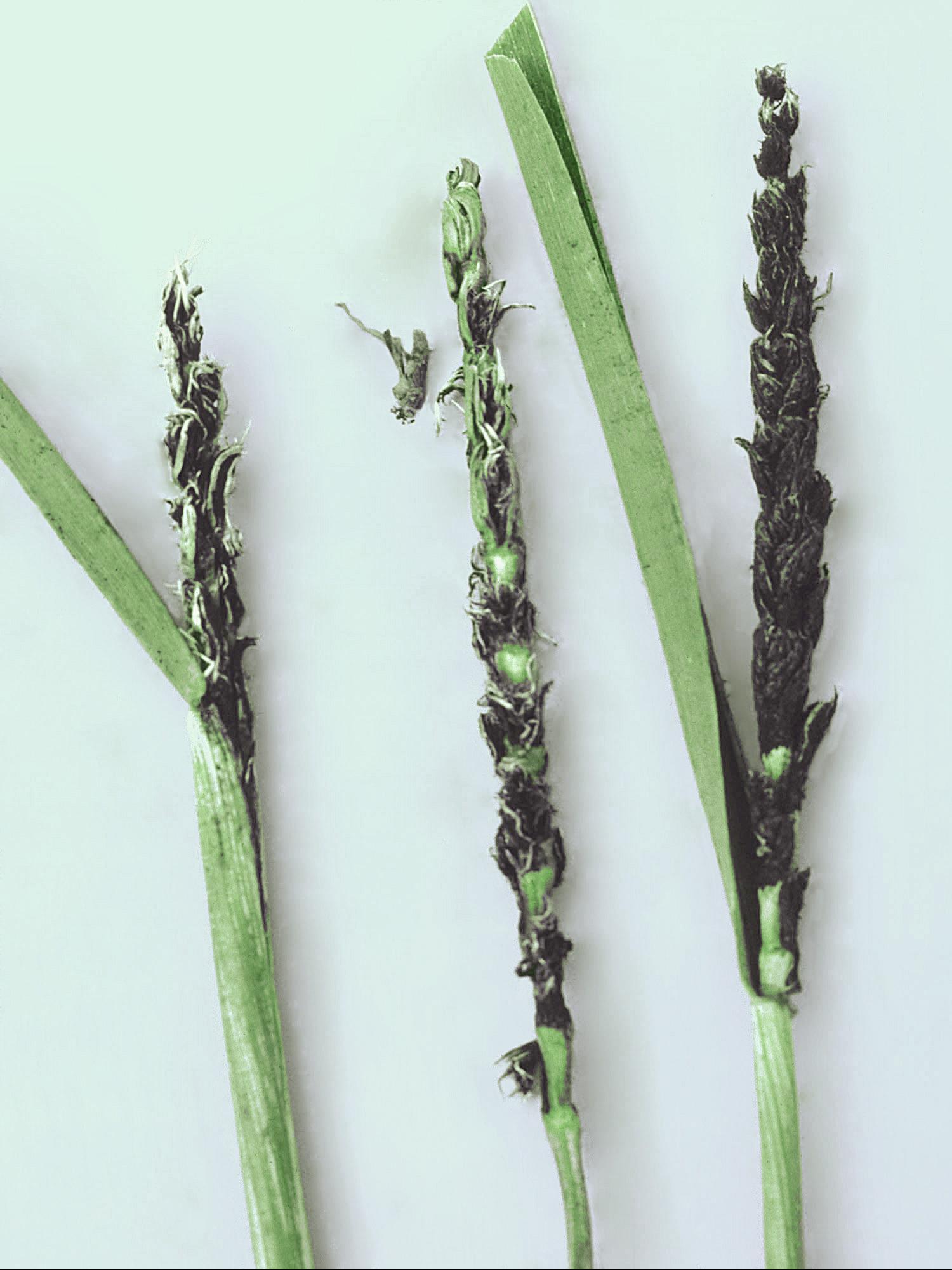 Légende: Spores noires d'Ustilago sur épis de blé de printemps