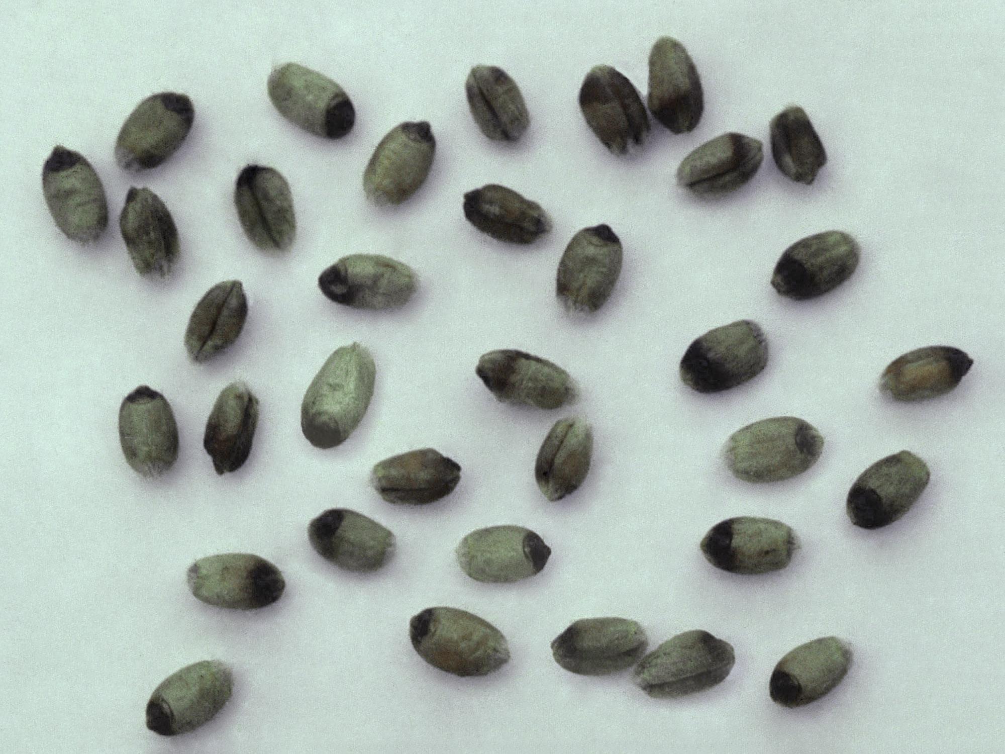 Description: Sur des grains de blé de printemps, l’extrémité des grains (germe) et le sillon prennent une teinte noire. Les tests de laboratoire ont révélé la présence du champignon Cochliobolus sativus, responsable de la mélanose chez le blé.