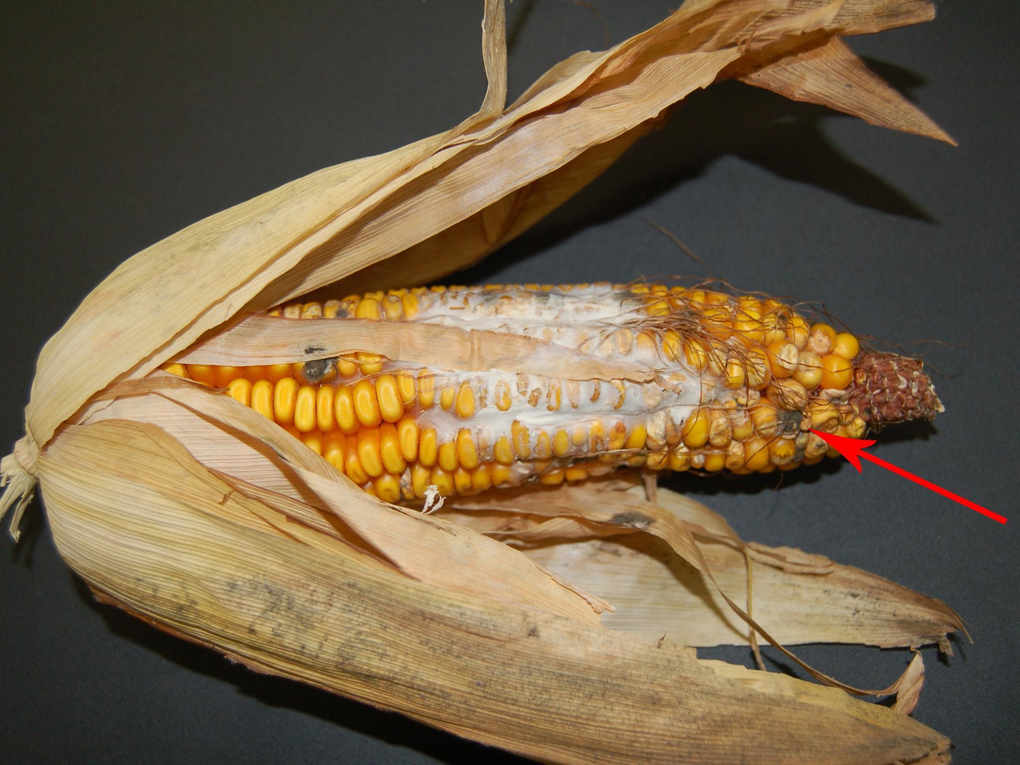 Description: Sur un épi de maïs grain et fourrager, présence d’un mycélium blanc qui engendre une pourriture affectant une proportion importante de l'épi. Certains grains sont également noirs (voir flèche). Les tests de laboratoire ont révélé la présence de deux maladies sur cet épi. La pourriture est causée par le champignon Fusarium poae, responsable de la fusariose de l’épi chez le maïs. Le noircissement des grains est occasionné par le champignon Cladosporium sp., responsable de la moisissure noire. Dans ce cas, il s'agit d'une infection secondaire.