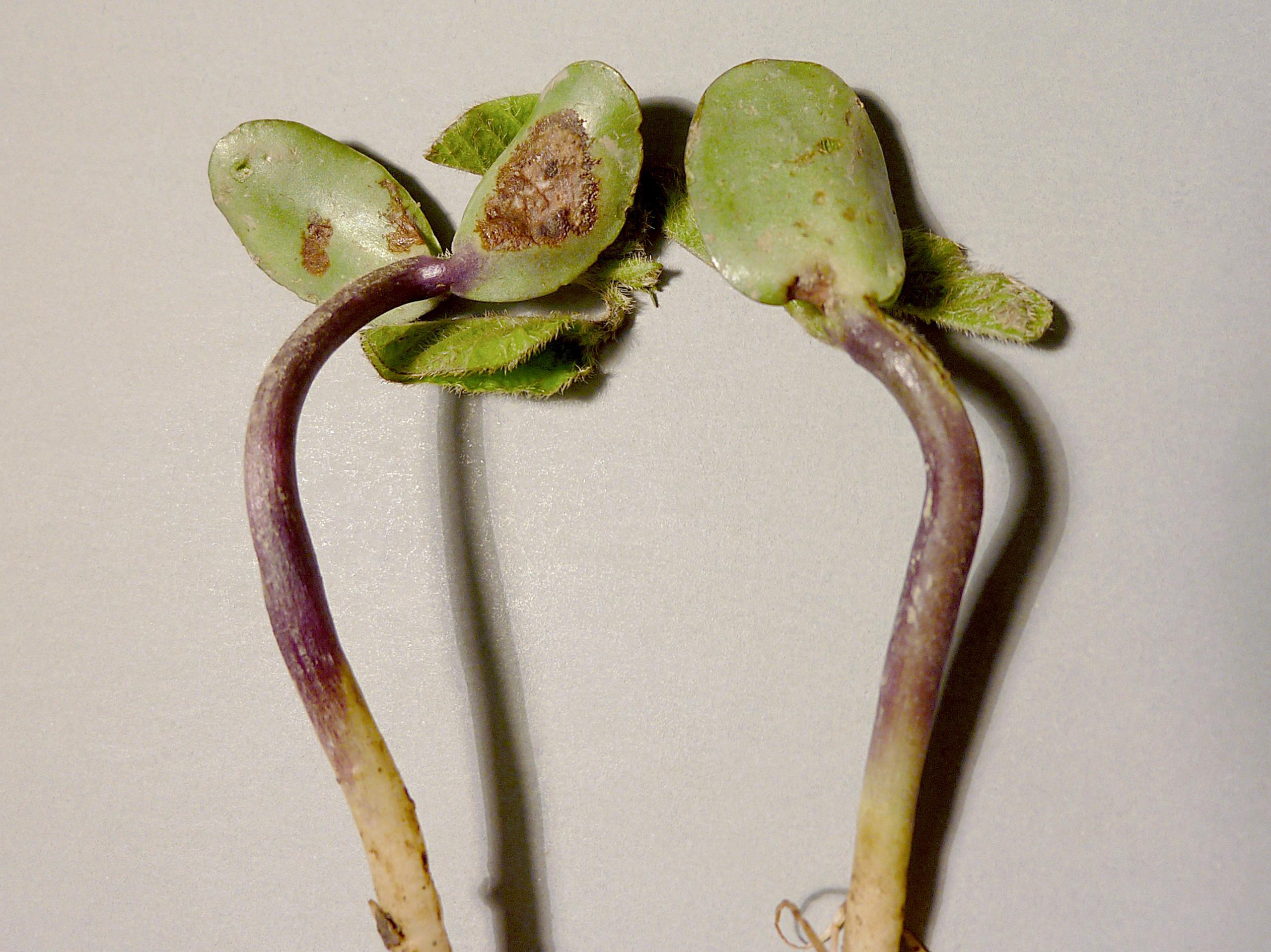 Description: Sur des cotylédons de soya, présence de taches brun foncé, d’une dimension variable, et d’une pourriture brune. Les tests de laboratoire ont révélé la présence de Phytophthora sojae, responsable de la fonte des semis chez le soya.