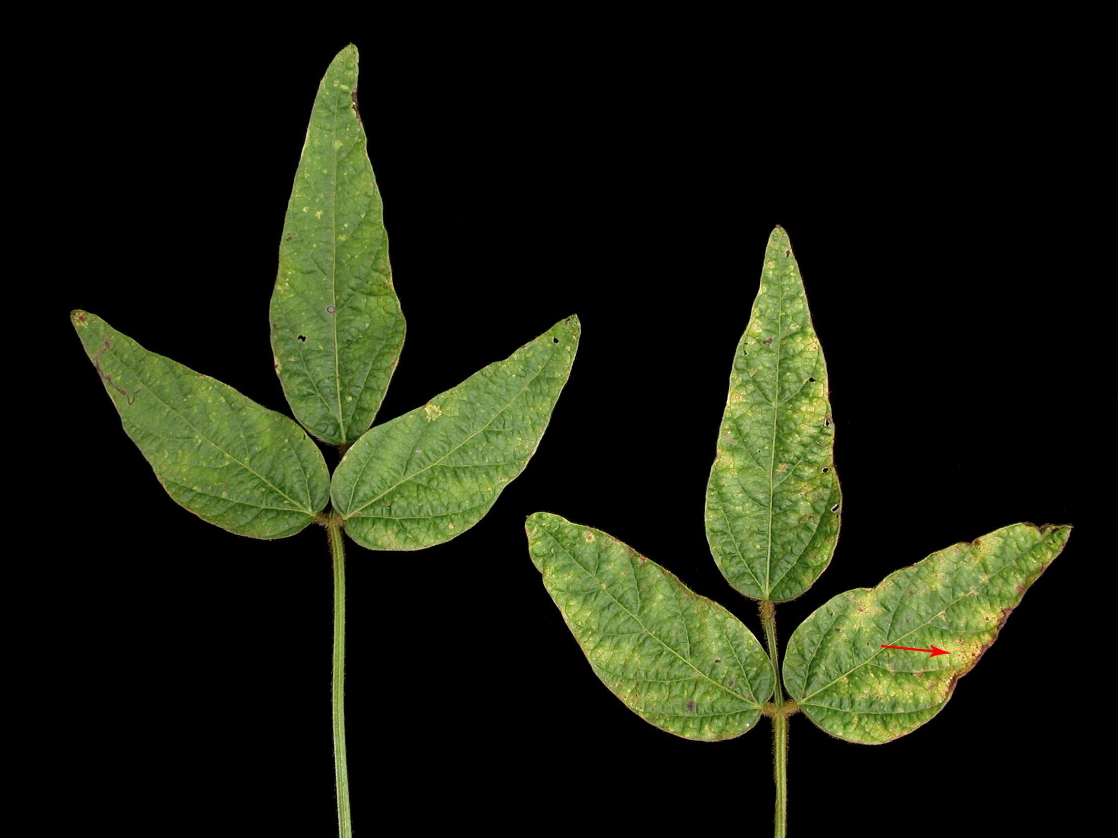 Description: À la face supérieure de feuilles de soya, présence de petites taches diffuses jaunes sur la feuille de gauche et de grandes taches jaunes et de petites taches brunes (voir flèche) sur la feuille de droite. Les observations microscopiques ont révélé la présence de l'agent pathogène Peronospora manshurica, responsable du mildiou chez le soya.