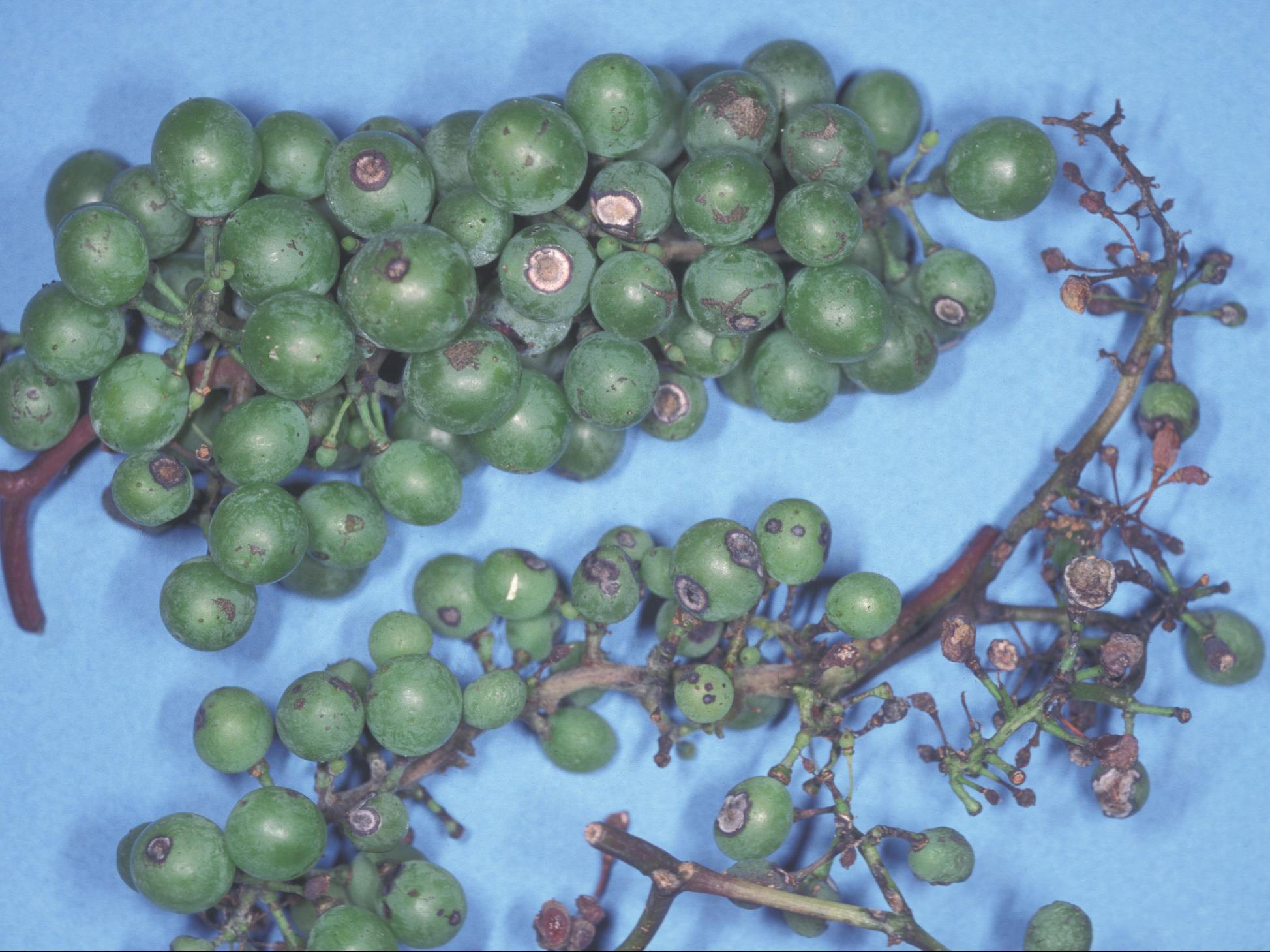 Description: Ces grappes de raisin (cv 'Vandal blanc') montrent l’évolution des symptômes de la maladie. Au début de l'infection, les taches sont plutôt circulaires et pourpre foncé à noire. Lorsqu’elles évoluent, elles sont encore circulaires, mais le centre devient blanchâtre à grisâtre avec une marge noire surélevée. Les fruits plus affectés sont affaissés, desséchés et ratatinés, conséquence ultime de l'infection. Les tests de laboratoire ont révélé la présence du champignon Elsinoe ampelina, responsable de l’anthracnose maculée chez la vigne.