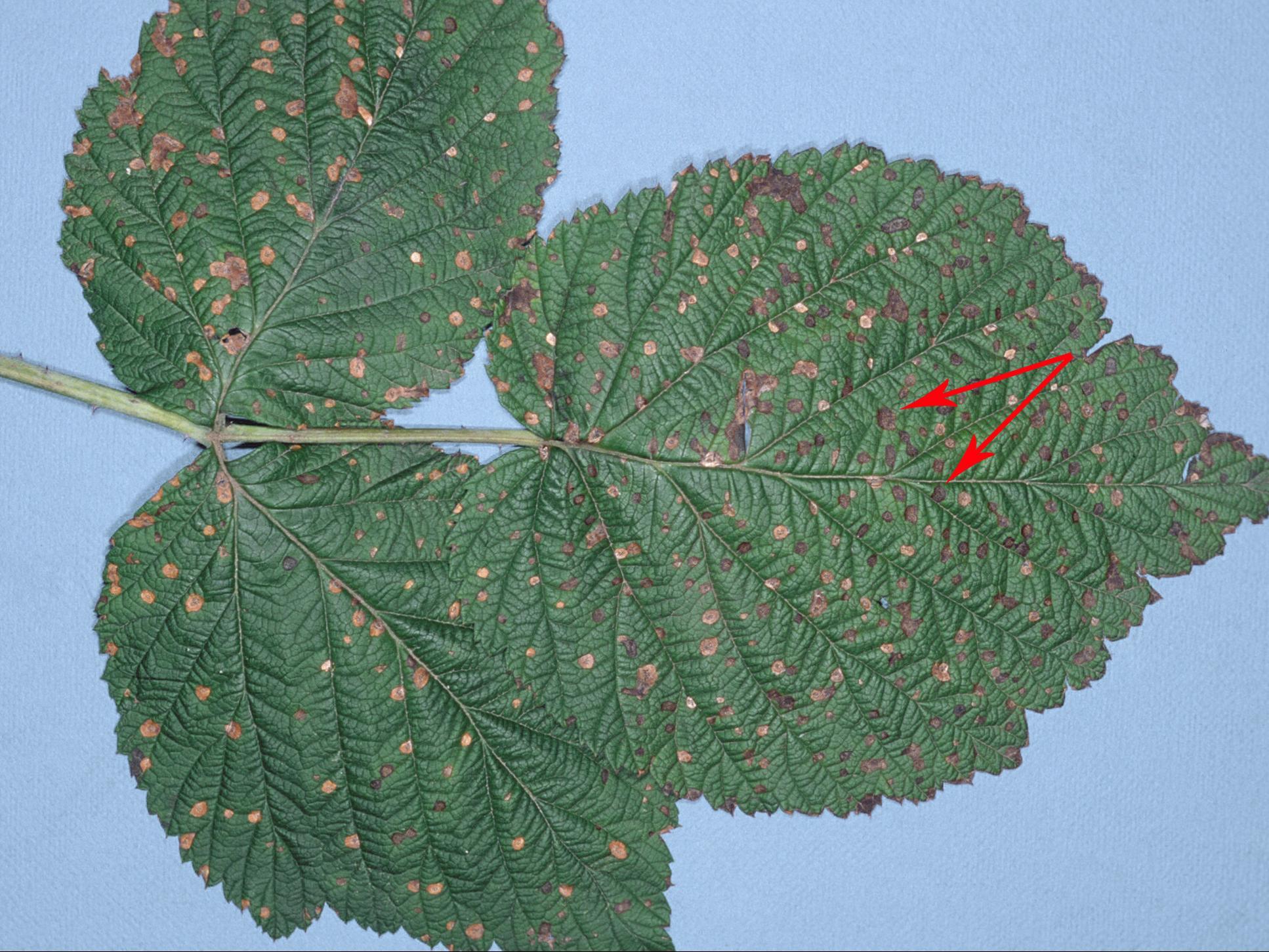 Description: Sur une feuille de framboisier rouge (cv 'Royalty'), présence de nombreuses taches circulaires, beiges à brun pâle, sans marge foncée ni halo jaune. Les taches sont distribuées uniformément sur le limbe et sans patron précis à la face supérieure. Présence de nombreuses ponctuations noires sur les taches (voir flèches). Les tests de laboratoire ont révélé la présence du champignon Sphaerulina sp., responsable de la tache septorienne chez le framboisier. Il s’agit probablement de Sphaerulina rubi.