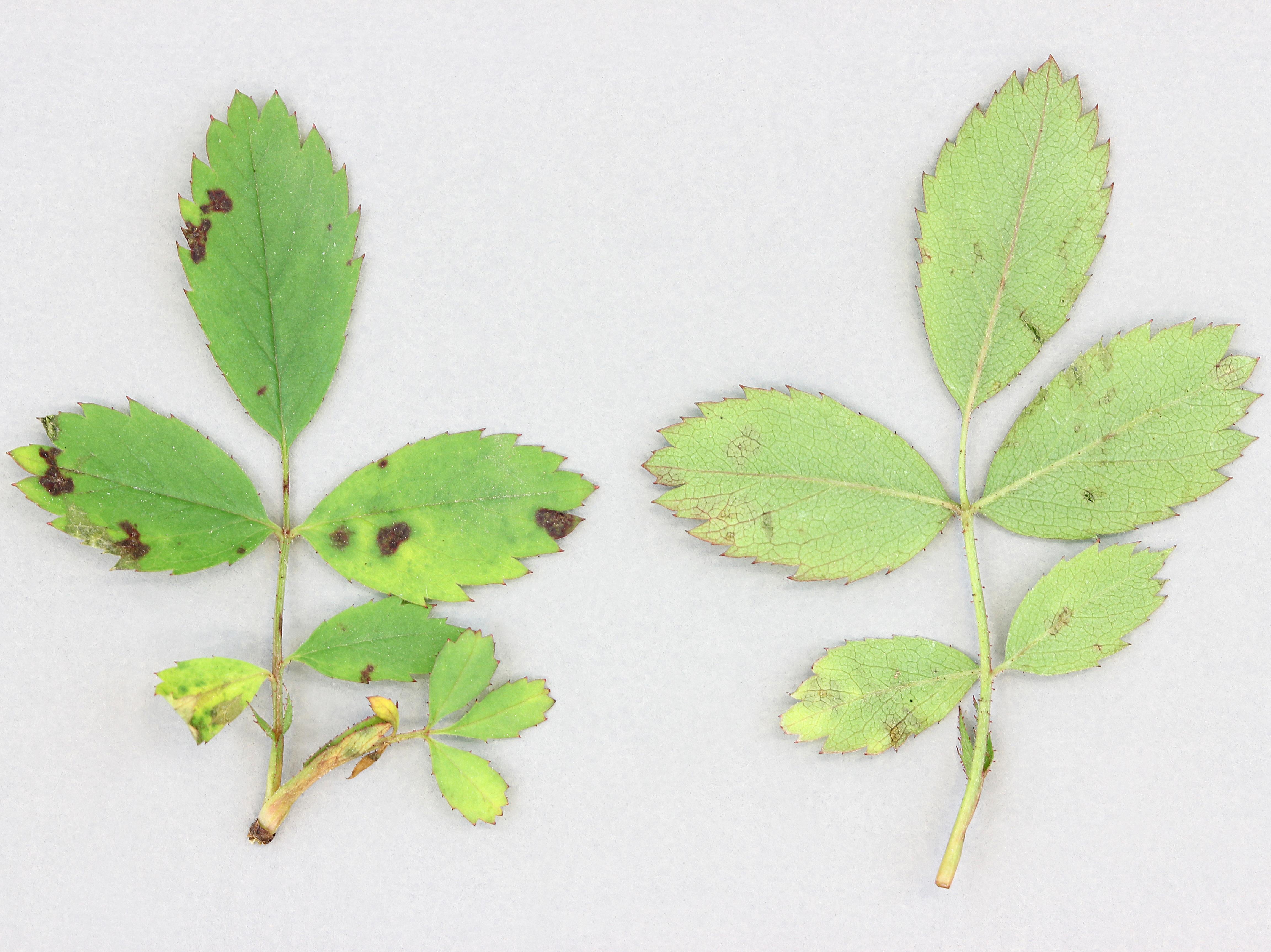 Description: Comparaison entre la face supérieure et inférieure d’une feuille de rosier (cv 'John Davis'). La face supérieure de la feuille montre des taches pourpres de forme irrégulière qui sont distribuées aléatoirement sur le limbe. Les taches ne traversent pas le limbe et ne sont pas visibles à la face inférieure. Les observations microscopiques ont révélé la présence du champignon Diplocarpon rosae, responsable de la tache noire chez le rosier.