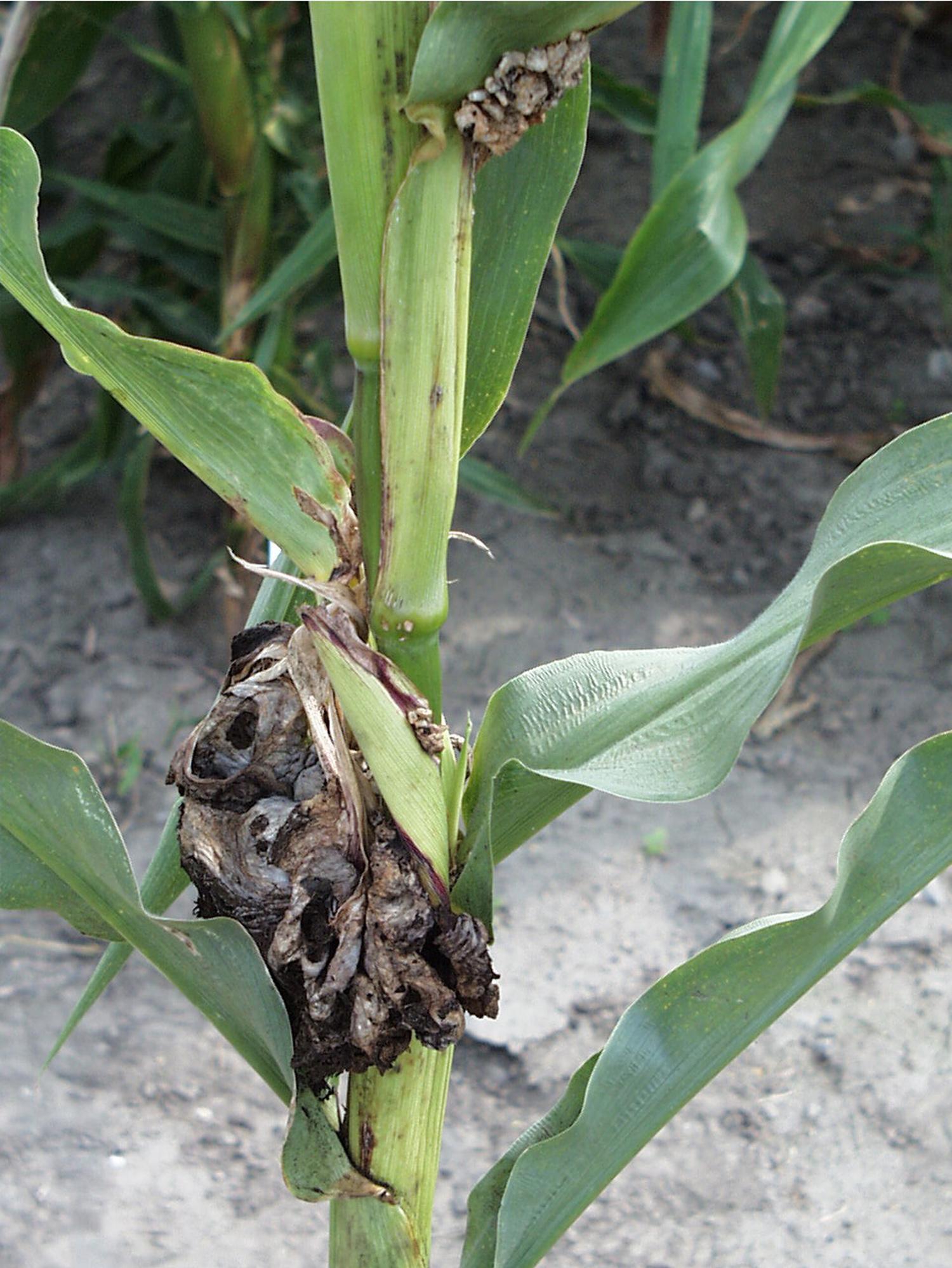 Description: Sur un plant de maïs grain et fourrager, présence de sévères tumeurs sur la partie inférieure de la tige. La membrane grisâtre qui couvre normalement les tumeurs s’est brisée, libérant des spores noires. Ces symptômes sont caractéristiques du champignon Ustilago maydis, responsable du charbon commun chez le maïs.