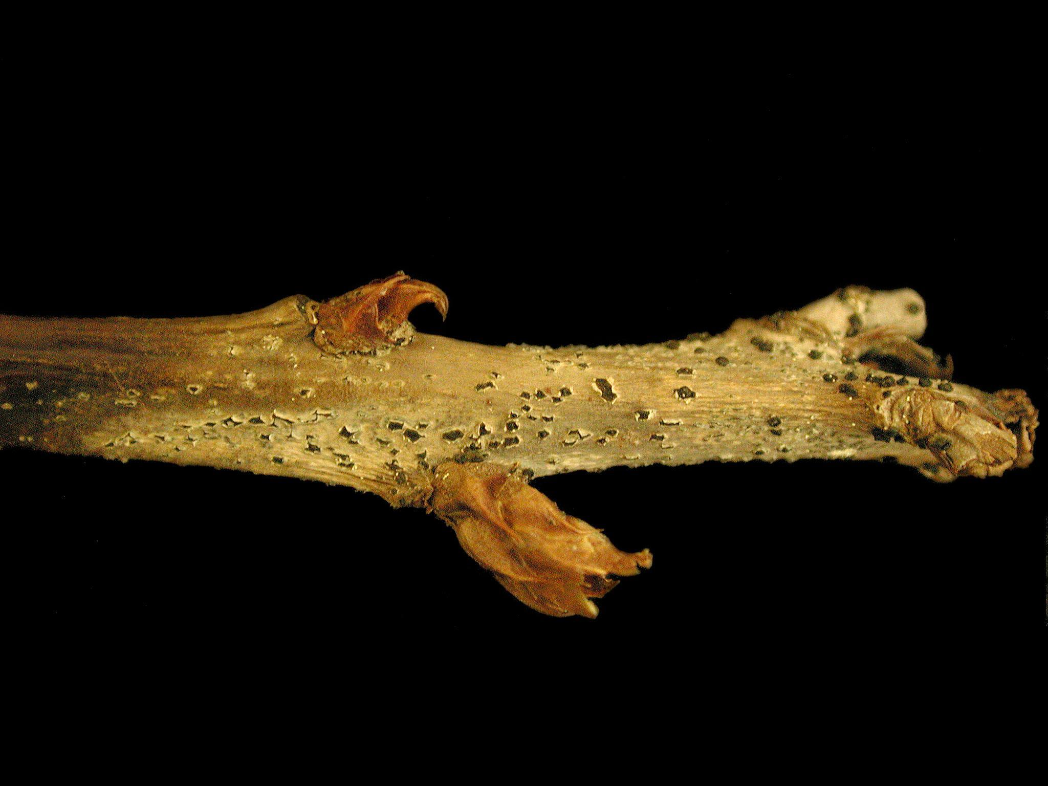 Description: À l’extrémité d’une jeune tige de bleuet en corymbe, présence d’un chancre grisâtre ponctué de pycnides noires. Ce chancre encercle un bourgeon à feuilles et le bourgeon terminal. Les tests de laboratoire ont révélé la présence du champignon Fusicoccum putrefaciens, responsable du chancre à Fusicoccum chez le bleuet en corymbe.