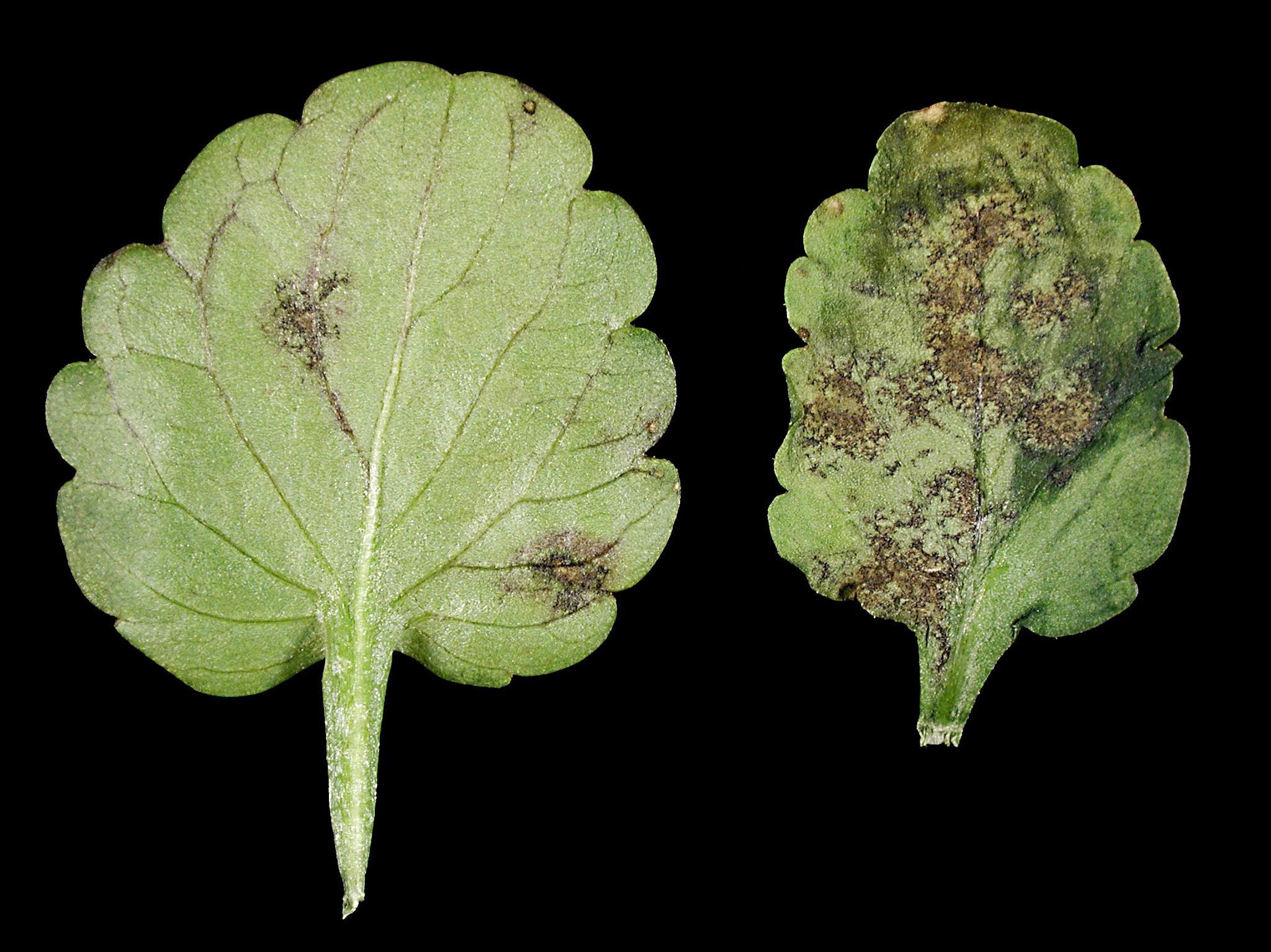 Description: Sur le limbe des feuilles de pensée provenant d’une serre, présence de taches irrégulières pourpres à brun foncé à noires. Les taches prennent l’apparence d’un fin réseau granuleux qui est en fait constitué des fructifications du champignon. Les feuilles comptent entre 2 et 15 taches et leur dimension varie entre 1 et 10 mm. Elles sont présentent à la face supérieure et inférieure. Les observations microscopiques ont révélé la présence du champignon Cercospora sp., responsable de la tache cercosporéenne. Chez la pensée, Cercospora violae est rapporté.