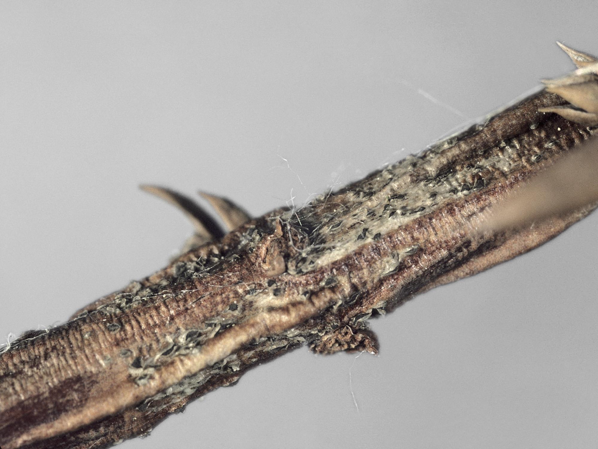 Description: Une jeune pousse d’un genévrier commun montre des fructifications noires. Les aiguilles étaient brunes et sèches. La brûlure débutait à l’extrémité de la pousse et n’affectait que celle-ci (non visible ici). Les observations microscopiques ont révélé la présence de pycnides et de spores α et β du champignon Phomopsis juniperivora, responsable de la brûlure phomopsienne chez le genévrier.