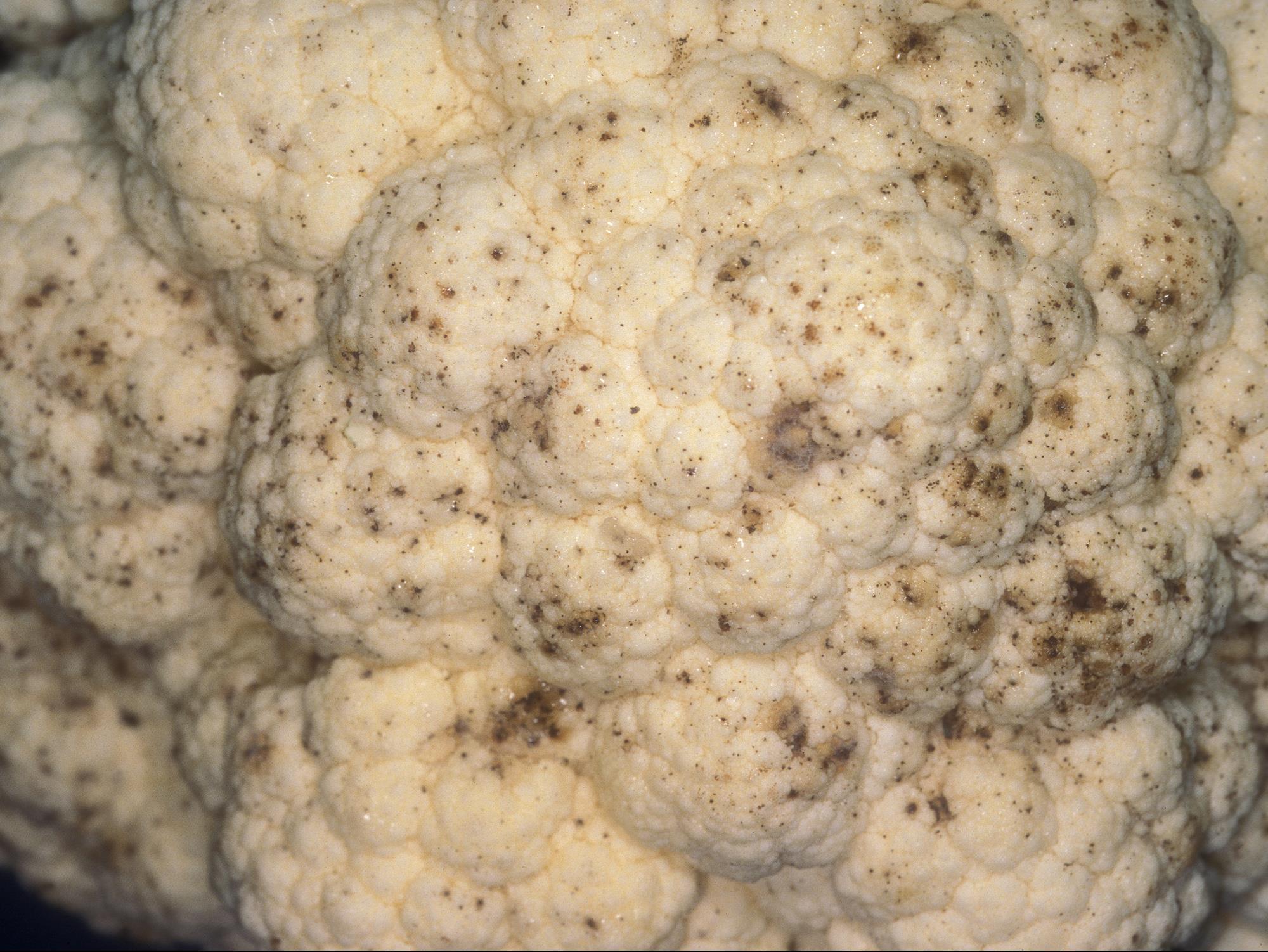 Description: Une vue rapprochée d’une inflorescence d’un chou-fleur provenant d’un champ montre la présence de nombreuses taches brunes à noires, d’une grosseur variable, localisées principalement sur le dessus de l’inflorescence. Ces taches causent l’affaissement des fleurons. Les tests de laboratoire ont révélé la présence du champignon Alternaria brassicicola, responsable de la tache noire alternarienne des crucifères. La distribution de la maladie au champ est aléatoire et le conseiller agricole mentionne que 75 % des plants sont affectés.