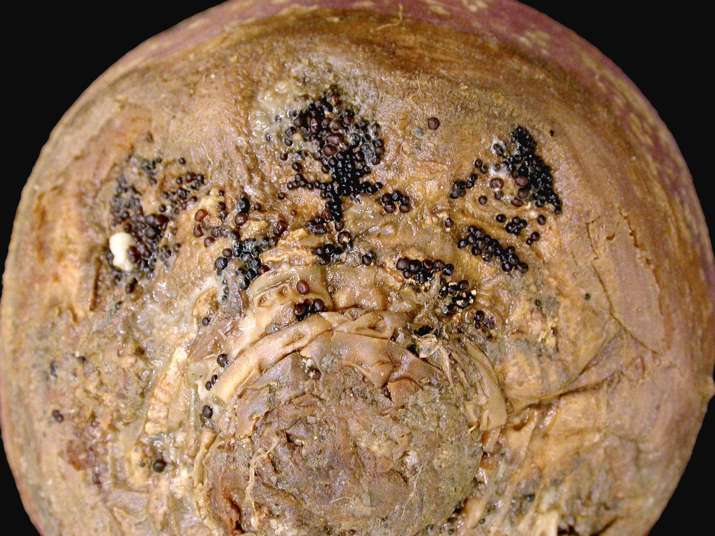 Description: Sur une racine tubérisée d’un rutabaga provenant d’un entrepôt, présence d’une importante pourriture molle et brune dans la partie basale de la racine. Dans les zones pourries, présence d’une fine croissance mycélienne blanche avec de nombreux sclérotes noirs, luisants et sphériques. Les observations microscopiques ont révélé la présence du champignon Sclerotium sp., responsable de la pourriture sclérotique. Il s’agit probablement de Sclerotium rolfsii.