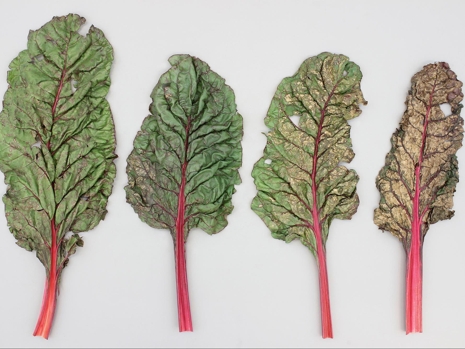 Description: Cette image montre l‘évolution du développement des taches sur des feuilles de bette à carde à nervures rouges. Les taches sont beiges avec une marge foncée, rondes à irrégulières, d'aspect sec et d’une dimension variable. Elles sont réparties aléatoirement entre les nervures. Les taches débutent à la face supérieure mais sont également présentent à la face inférieure. Plusieurs taches se regroupent pour former de larges plages beiges d'aspect brûlé. Les tests de laboratoire ont révélé la présence du champignon Alternaria alternata, responsable de la tache alternarienne.
