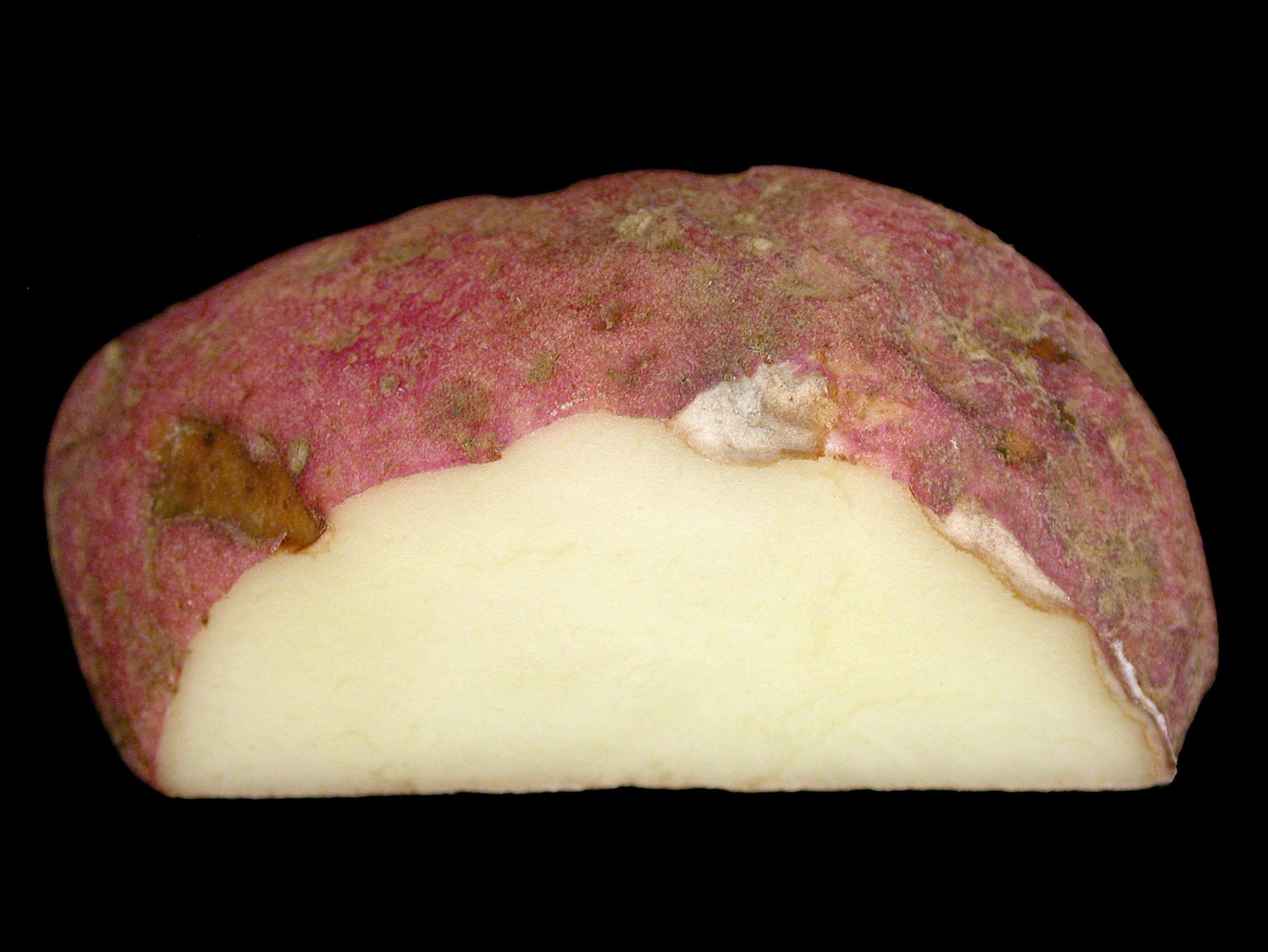 Description: Un tubercule de pomme de terre rouge (cv 'Norland') provenant d’un entrepôt montre une pelure terne, brunâtre, et rugueuse. Cette anomalie de coloration couvre parfois un pourcentage élevé de la surface du périderme. Des taches brunes superficielles et légèrement dépressives sont également observées sur le périderme. La coloration brune des taches pénètre peu dans la chair. Les tests de laboratoire ont révélé la présence du champignon Colletotrichum coccodes, responsable de la dartrose chez la pomme de terre.