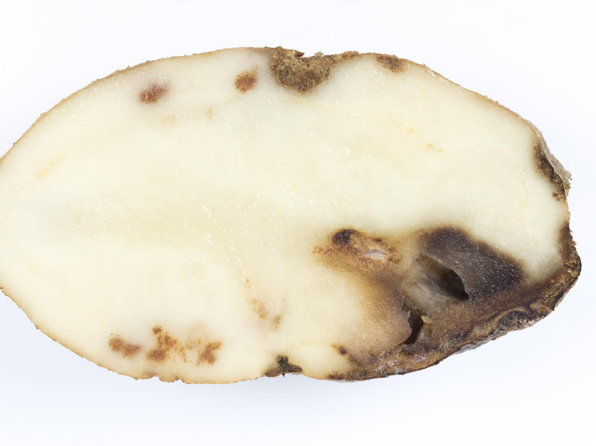 Légende: Brunissement et cavités dans la chair d'un tubercule