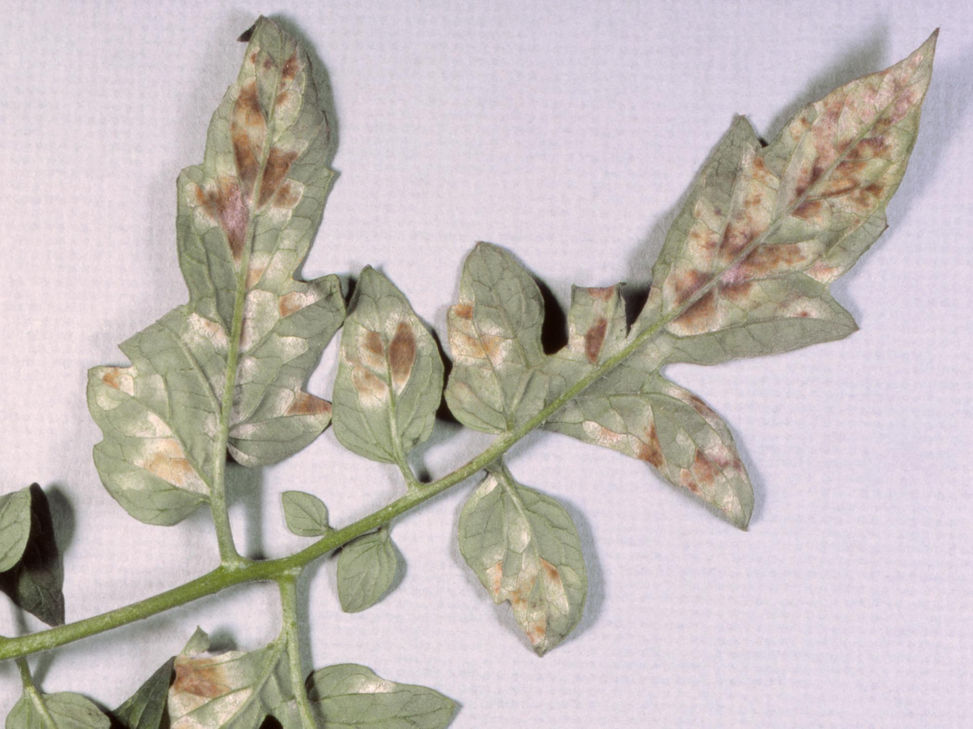 Légende: Taches blanches et mycélium brun sur feuille de tomate