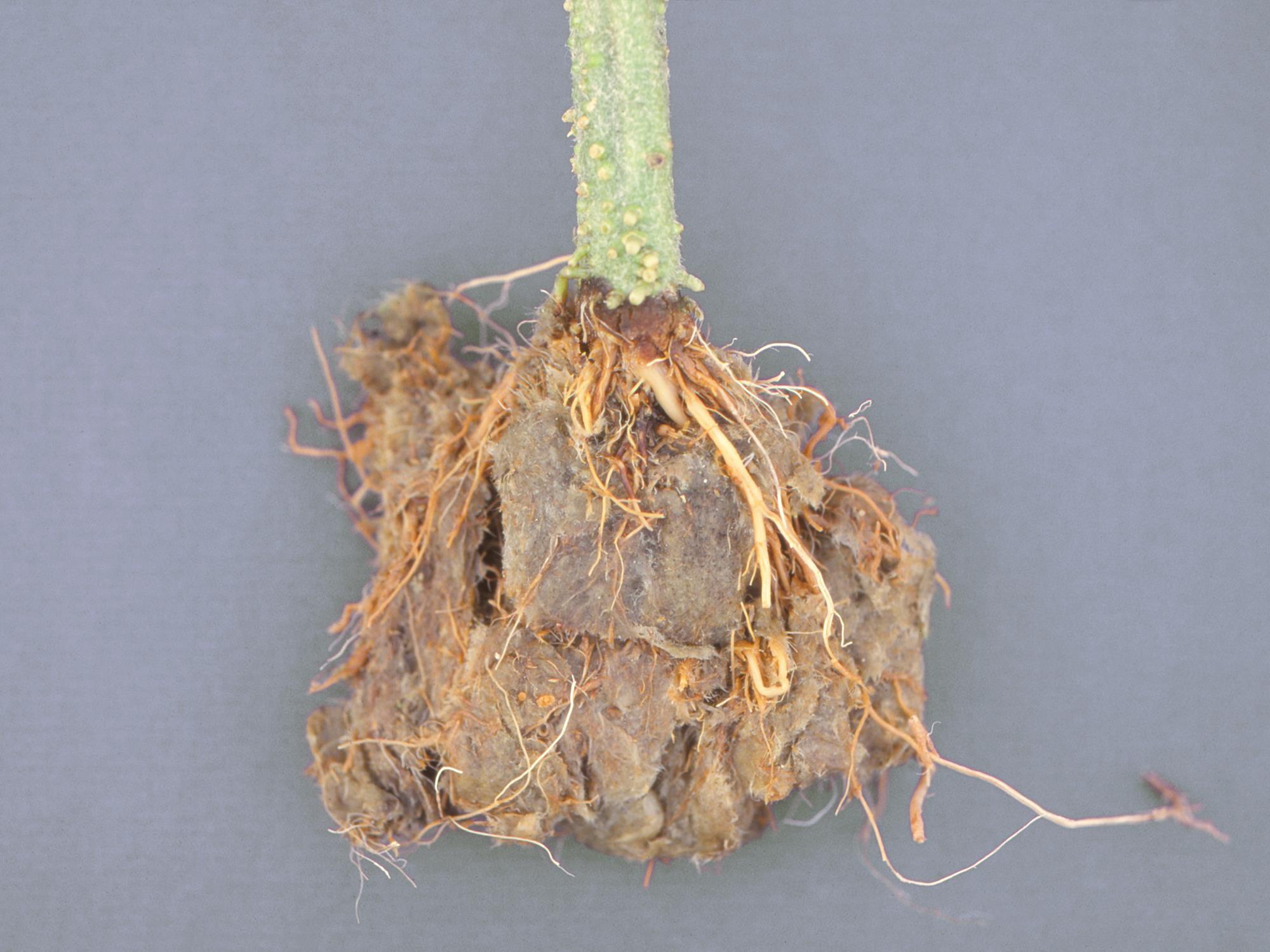 Description: La partie basale d’un plant de tomate de serre (cv 'Trust') montre un chancre brun foncé au collet. Les racines sont également brunes. Les tests de laboratoire et de pouvoir pathogène sur des plantules de tomate ont révélé la présence de Pythium aphanidermatum, responsable du pourridié pythien chez la tomate.