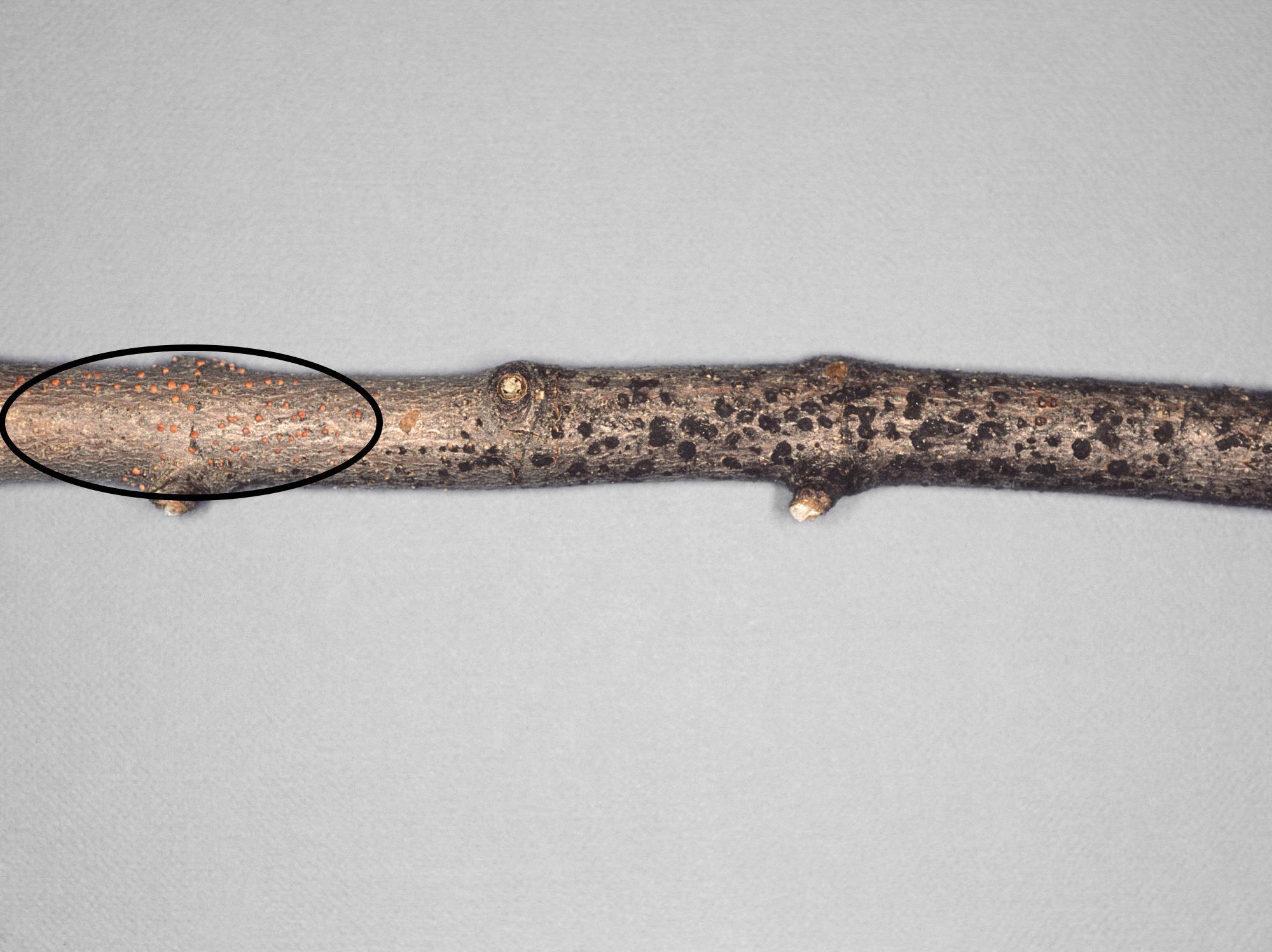 Description: Sur l’écorce d’une branche d’un érable, présence de nombreuses sporodochies orange (voir cercle). Les tests de laboratoire ont révélé la présence du champignon Nectria cinnabarina, responsable du dépérissement nectrien (maladie du corail) chez l’érable de Norvège. Notez que les petites fructifications noires observées dans la partie inférieure gauche de la branche sont causées par le champignon Stegonsporium pyriforme, responsable du dépérissement et du chancre stégonosporien chez plusieurs espèces d'érable.