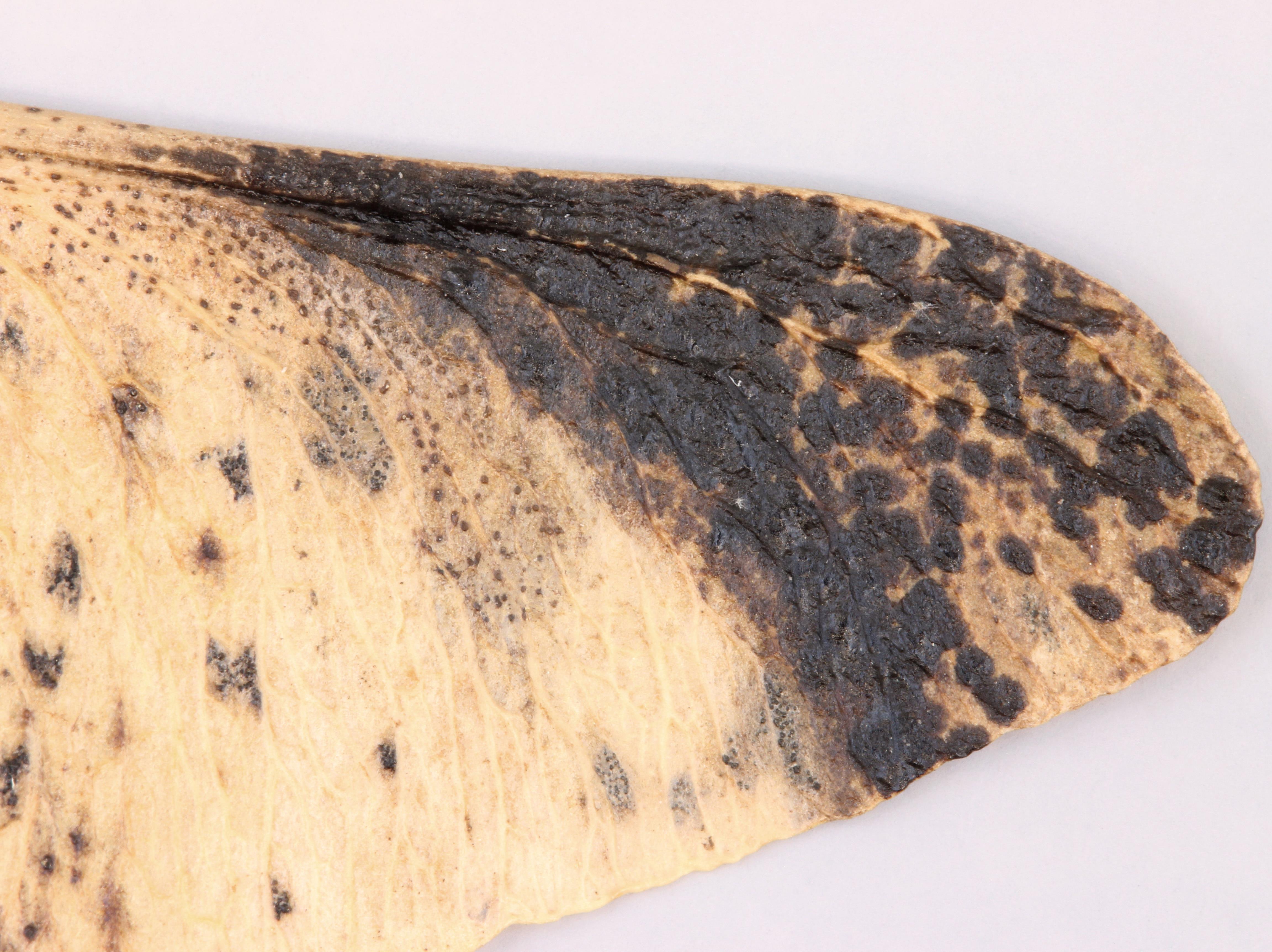 Description: Une vue rapprochée d’une samare provenant d’un érable de Norvège montre de petites taches noires plutôt circulaires. Chez l’érable de Norvège, ce symptôme est caractéristique de la tache goudronneuse causée par le champignon Rhytisma acerinum.