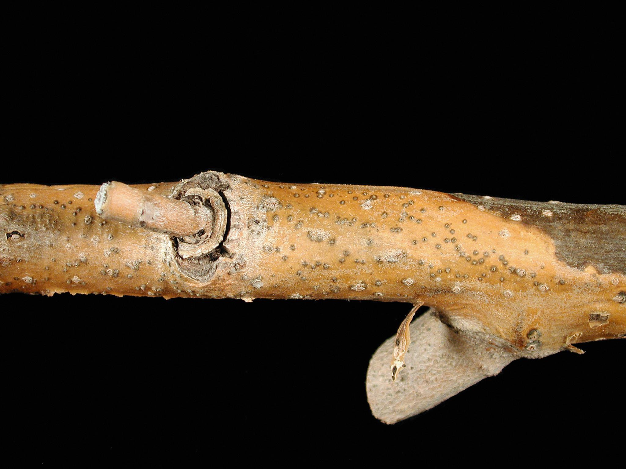 Légende: Chancre et fructifications noires sur branche de peuplier