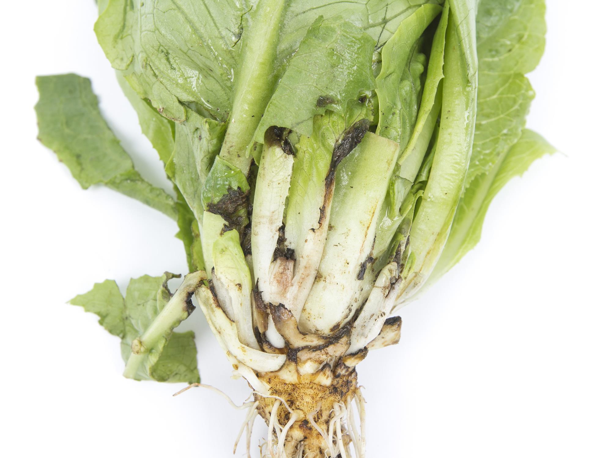 Description: Un plant de laitue romaine montre une pourriture à la base des feuilles. Un mycélium était également présent entre la base des feuilles à l’intérieur du feuillage (non visible ici). Les feuilles basales et médianes sont affectées. Les observations microscopiques ont révélé la présence du champignon Rhizoctonia solani, responsable du rhizoctone brune ou pourriture basale chez la laitue. Aucune bactérie phytopathogène n'a été isolée des tissus pourris.