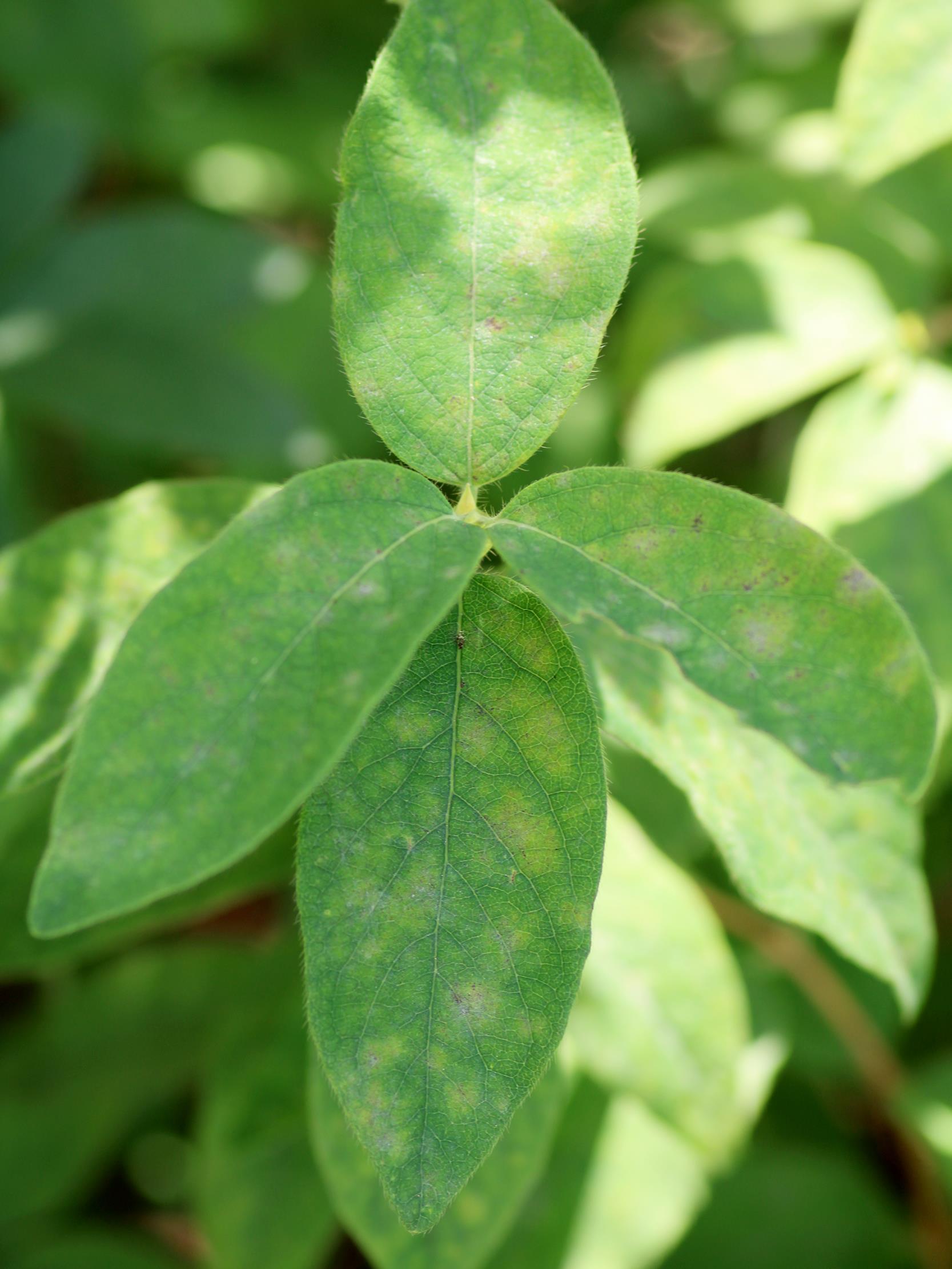 Description: Le léger duvet blanc que l'on peut observer sur la face supérieure de la feuille de camérisier correspond au mycélium de Erysiphe lonicerae. Des taches circulaires chlorotiques apparaissent progressivement aux sites d'infection.