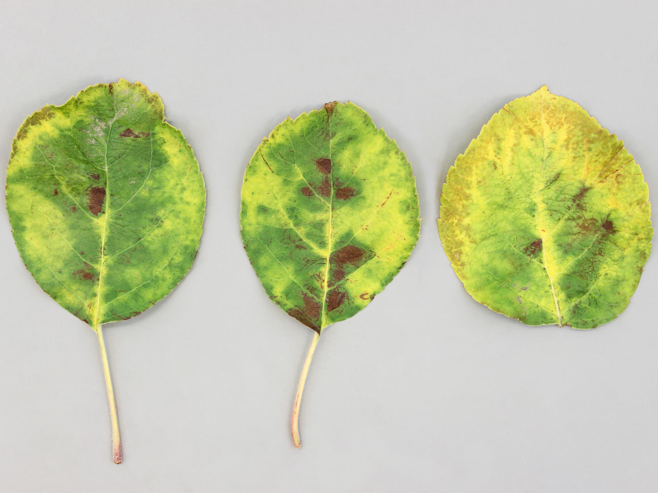 Description: Des feuilles d'un pommier montrent un jaunissement du limbe et des nervures et quelques taches brun rougeâtre. Les tests de laboratoire ont révélé la présence d’un phytoplasme et ce résultat a été conformé par le séquençage d’une partie de son génome. Selon le résultat du séquençage, il pourrait s’agir du phytoplasme de la jaunisse de l’aster.