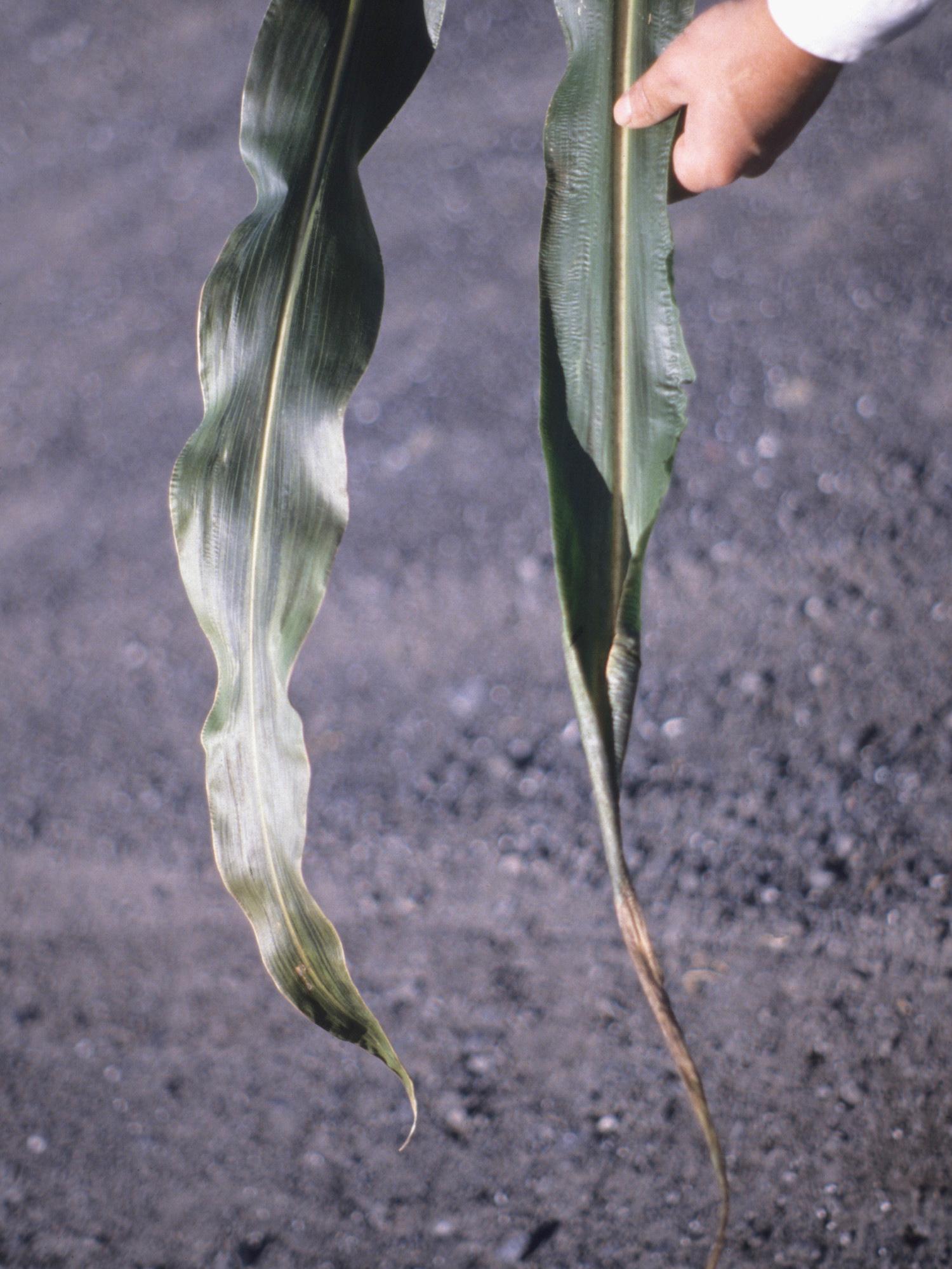 Description: Les feuilles de maïs grain et fourrager sont déformées (enroulement, en forme de « queue d’oignon ») et brûlées à l’apex (feuille de droite). Ces symptômes sont attribuables à une dose trop élevée de l'herbicide 2,4-D.