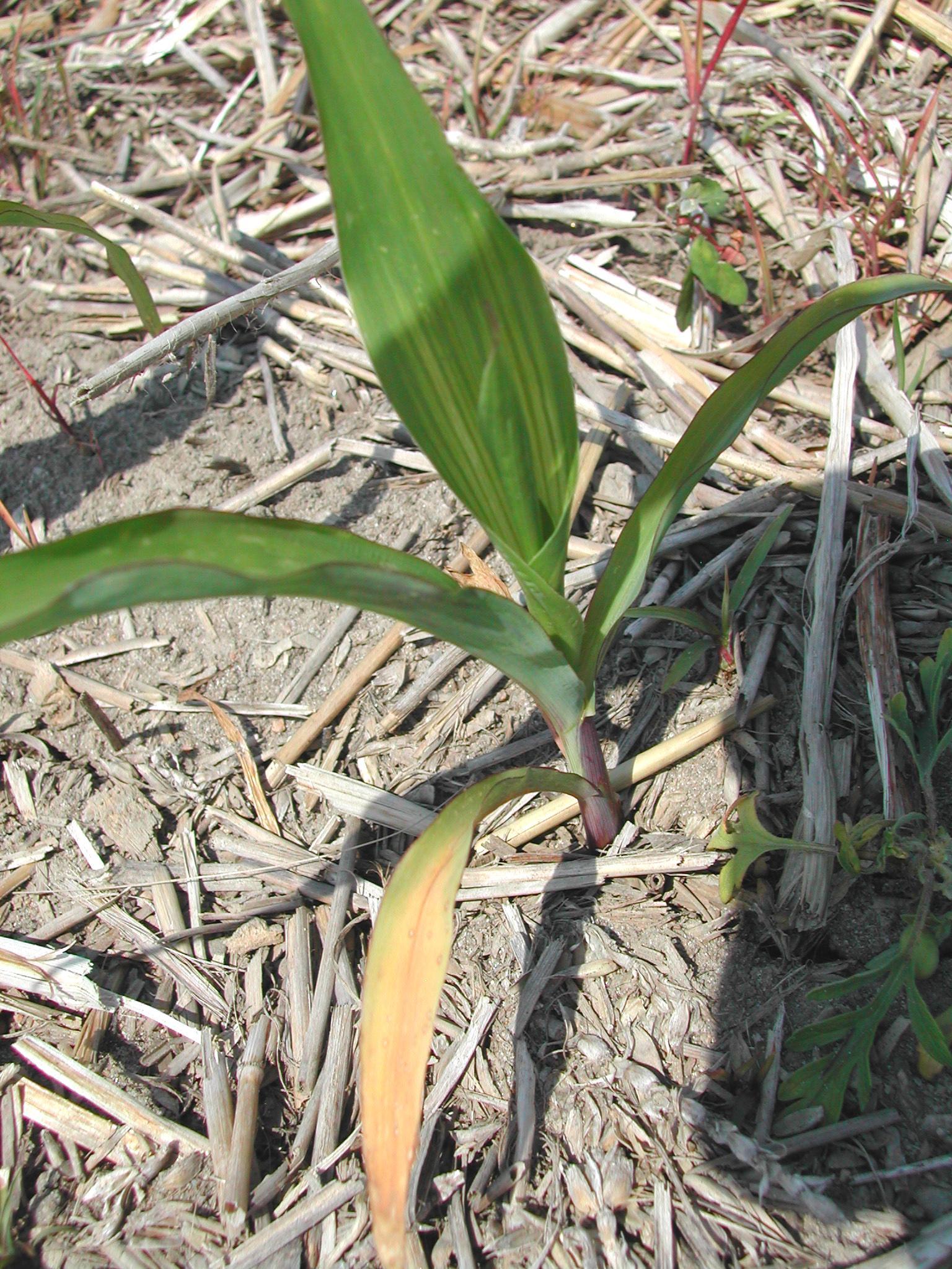 Description: Sur une feuille basale d’un plant de maïs grain et fourrager d’une production biologique, présence d’une anomalie de coloration orange du limbe. Les feuilles médianes ont un blanchiment du limbe en forme de bandes. Ces symptômes sont apparus à la suite d’une dérive de l’herbicide glyphosate appliqué dans un champ de maïs voisin.