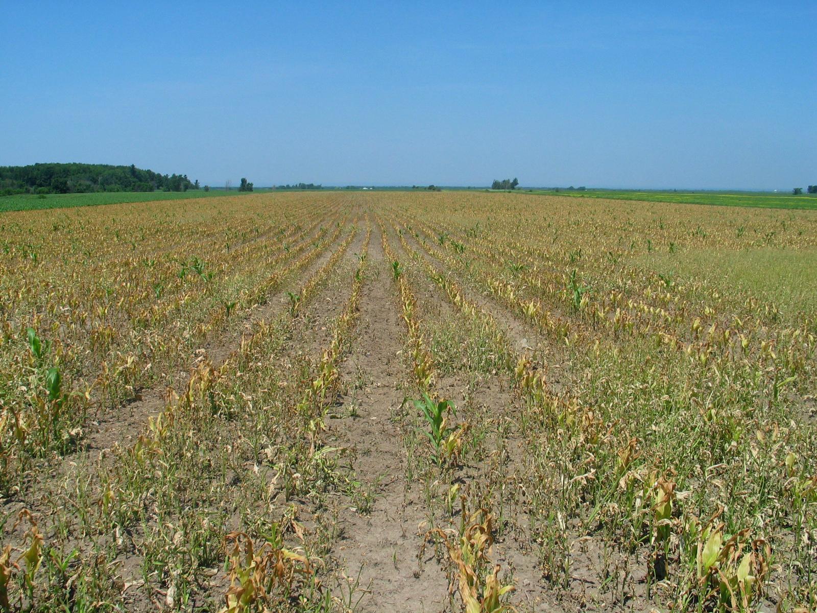 Description: Les plants de maïs grain et fourrager montrent un jaunissement important et un dépérissement. Ces symptômes sont attribuables à l’application par erreur de l’herbicide LIBERTY (glufosinate d’ammonium) sur du maïs grain et fourrager non transgénique. Tous les tissus des végétaux verts sont sensibles à cet herbicide, sauf dans les cultures conçues pour le tolérer.