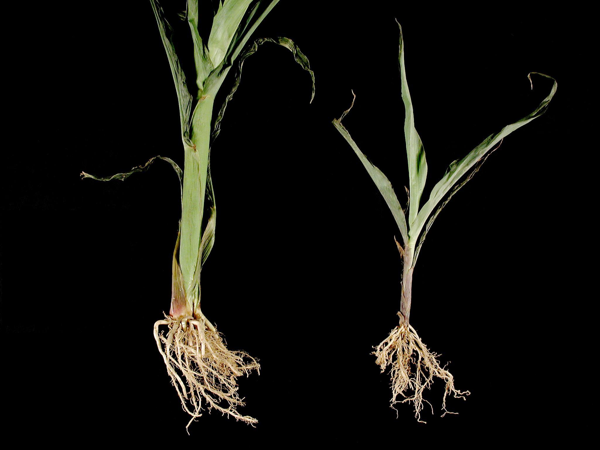 Légende: Comparaison entre un plant de maïs grain et fourrager sain et affecté