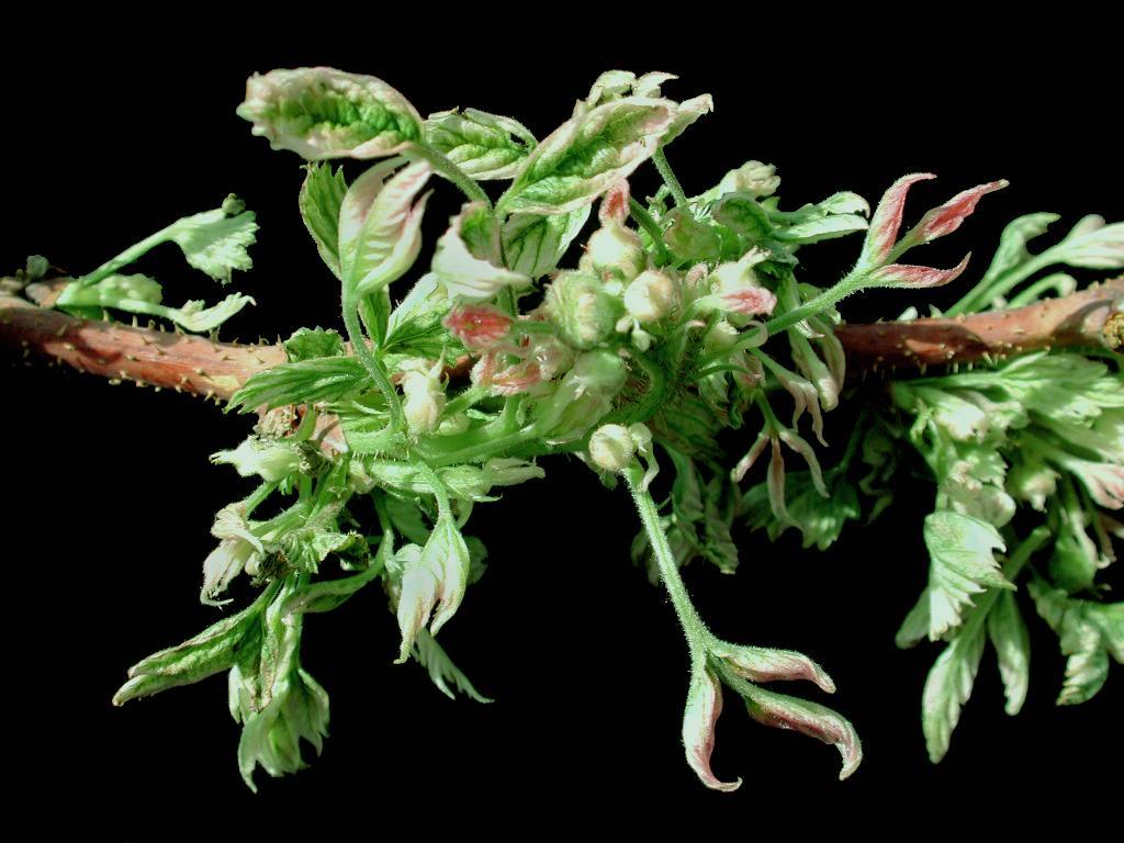 Description: D'importantes malformations du feuillage sont observées sur ce plant de framboisier (cv 'Killarney'). Elles se caractérisent par le développement de bouquets foliaires denses et compacts (feuilles regroupées en rosette) ainsi que par une réduction importante du limbe. Ces malformations sont accompagnées d'une anomalie de coloration blanche accentuée de rose. Les symptômes ont été observés au printemps. Ils sont causés par une phytotoxicité à l’herbicide glyphosate. Pour produire ce type de symptômes, l'application du glyphosate a été effectuée la saison précédente. Seules les feuilles des tiges fructifères présentent ces symptômes.