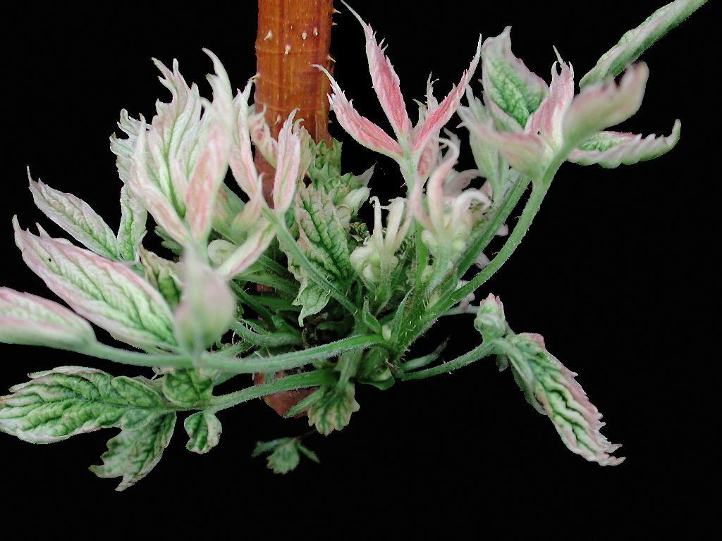 Légende: Malformation et rosissement des jeunes feuilles de framboisier