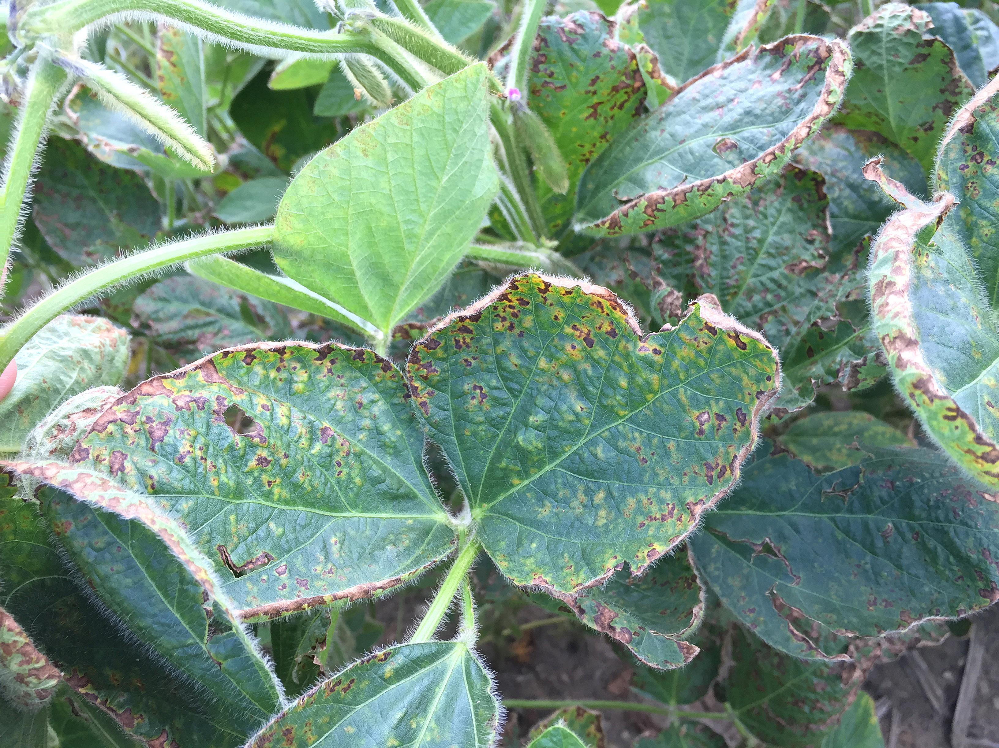 Légende: Feuilles de soya avec jaunissement internervaire et brûlures