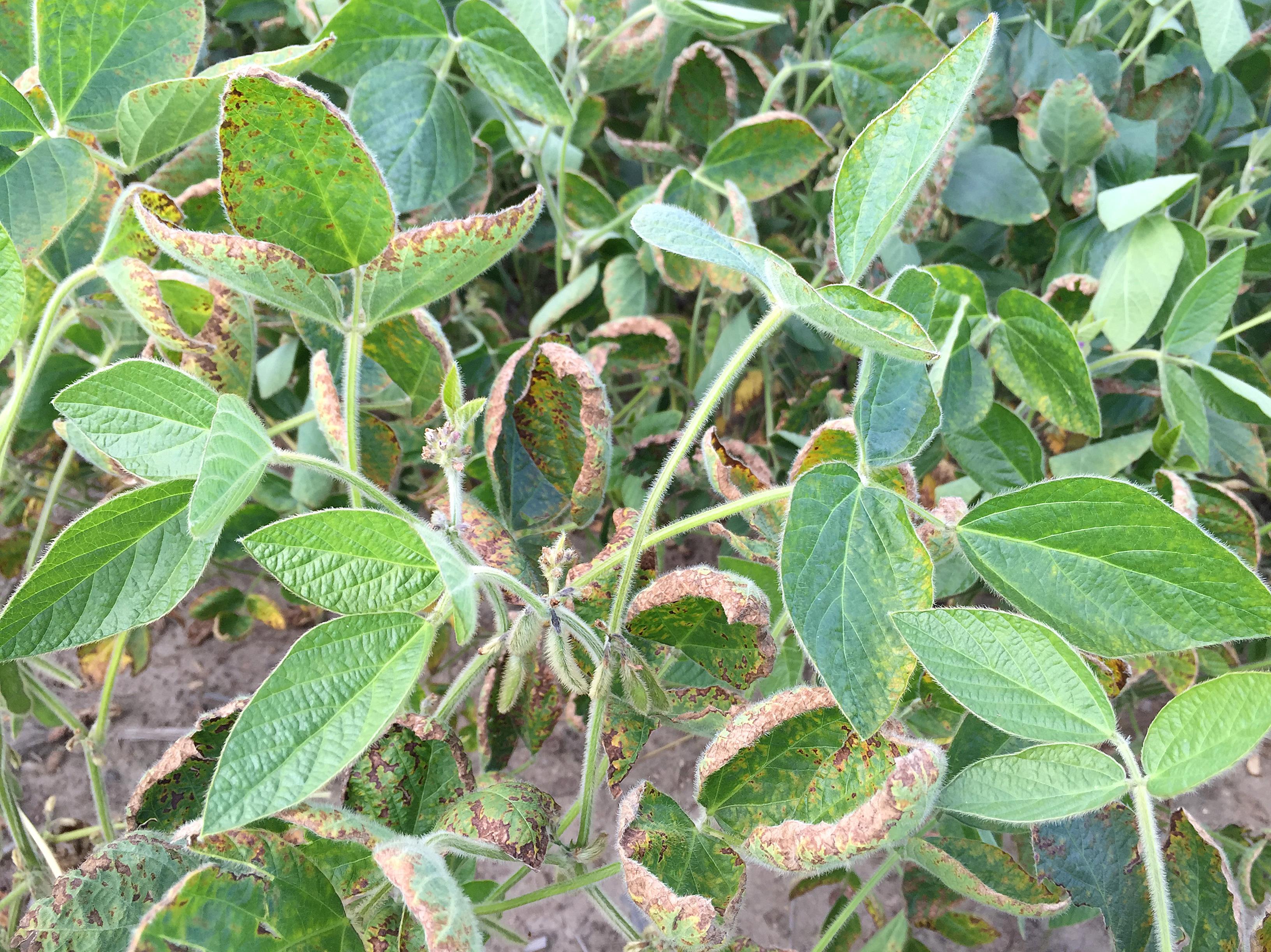 Description: Brûlure des tissus foliaires accompagnée d’une déformation du limbe, attribuables aux résidus de CALLISTO® GT (mésotrione; glyphosate). Typiquement, les plantes sensibles à la mésotrione présentent un blanchiment (ou un jaunissement) internervaire, suivi d’une nécrose des tissus. L’application de la mésotrione dans un soya ne tolérant pas l’herbicide peut occasionner d’importants dommages à la culture, des pertes de rendement voire la mort de la culture.