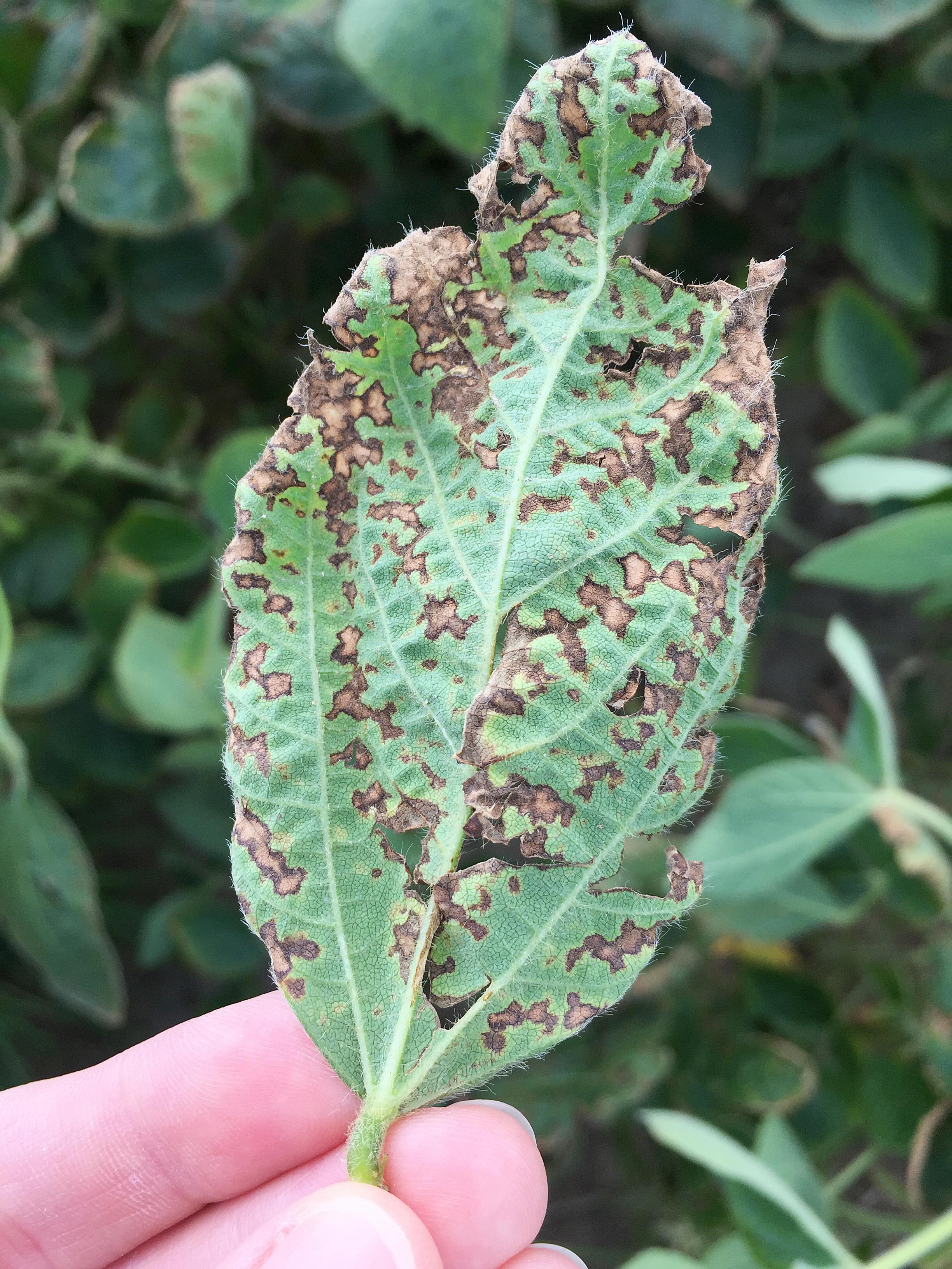 Légende: Foliole de soya avec brûlures à la face inférieure