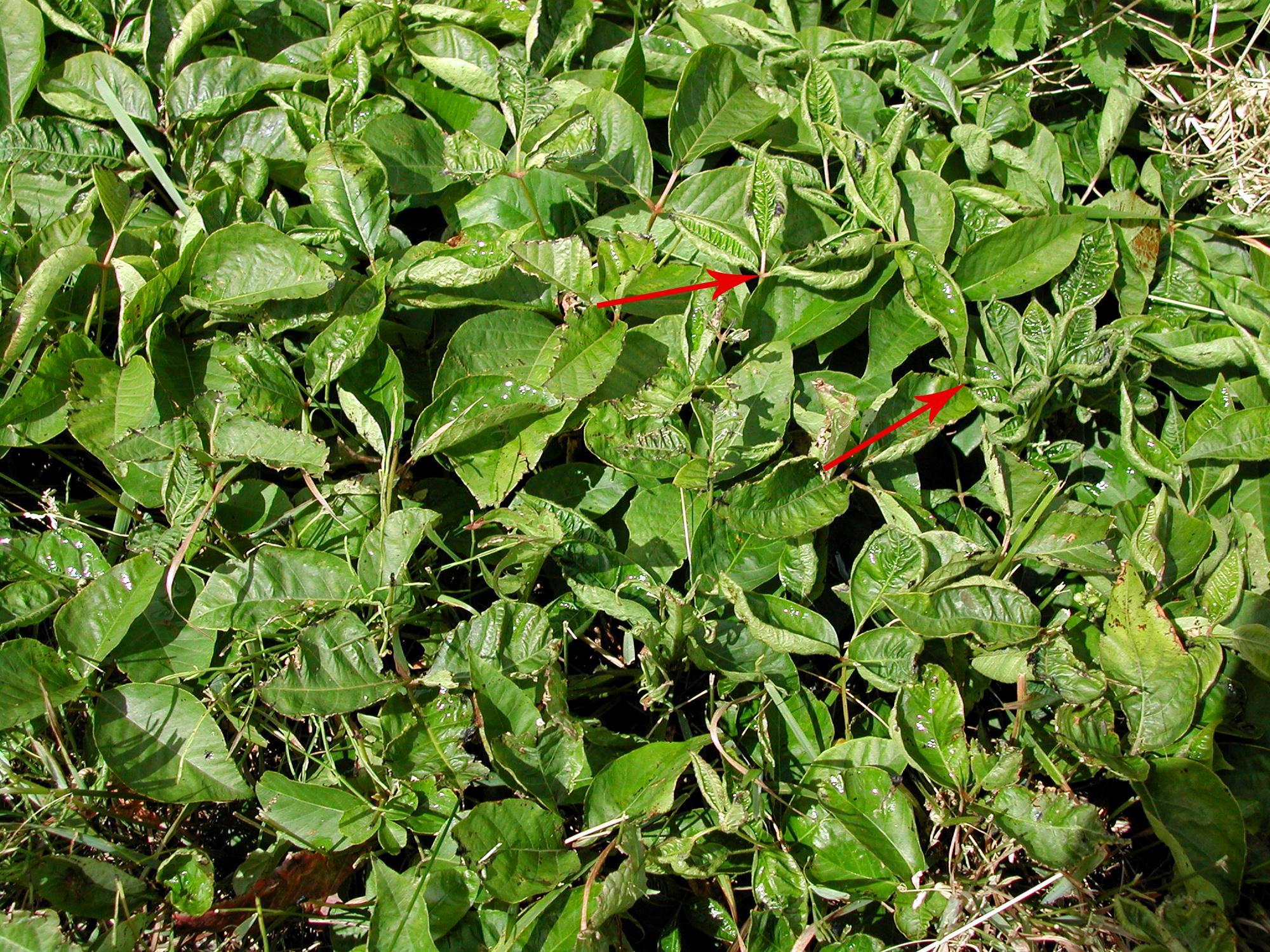 Description: Les plants de soya sont déformés et les feuilles enroulées (voir flèches). Ces anomalies sont attribuables à une dérive d’un herbicide de type « phytohormone » (groupe 4) pour contrer le développement de l'herbe à la puce (Toxicodendron radicans). Cette dernière est très présente et ne semble pas affectée par l’herbicide. Malheureusement, la matière active n’a pu être identifiée.