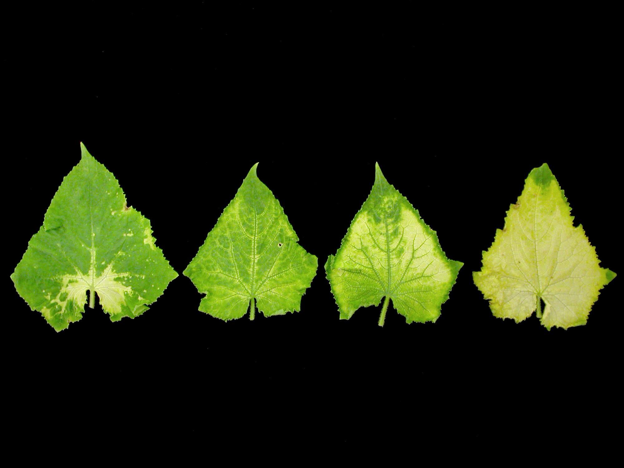 Description: Les feuilles de concombres libanais cultivés en serre présentent un jaunissement varié apparaissant à divers endroits. De gauche à droite, nous observons : 1) un jaunissement du limbe et des nervures principales, à la base de la feuille, 2) un jaunissement généralisé des nervures, 3) un jaunissement généralisé du limbe avec des nervures vertes et du gaufrage du limbe vert et 4) une marge verte sur le limbe jaune.