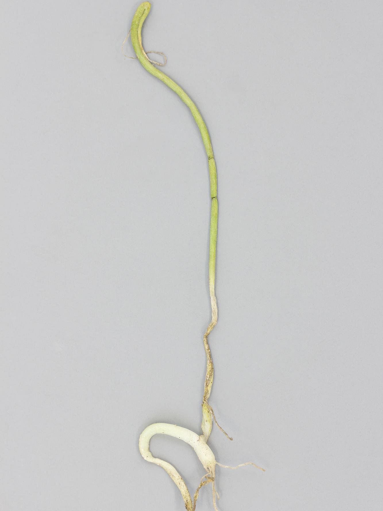 Description: La plantule d'oignon sec provenant d’un champ présente de sévères malformations au niveau des feuilles et du collet. Les feuilles sont enroulées en spirale ou en forme de crochet. Quant à lui, le collet est soit gonflé ou recourbé. La taille de la plante est également réduite. Les dommages observés sont attribuables à une phytotoxicité par l’herbicide FRONTIER MAX (diméthénamide-P) appliqué trop tôt en saison (en préémergence). Au champ, plus de 75 % des plants sont affectés.