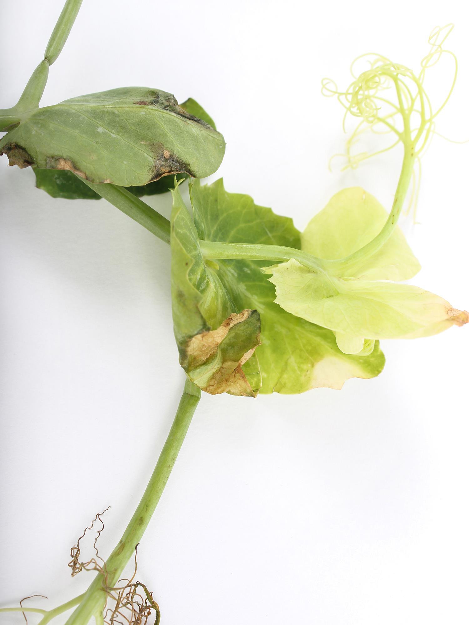 Légende: Jaunissement à blanchiment des jeunes feuilles de pois