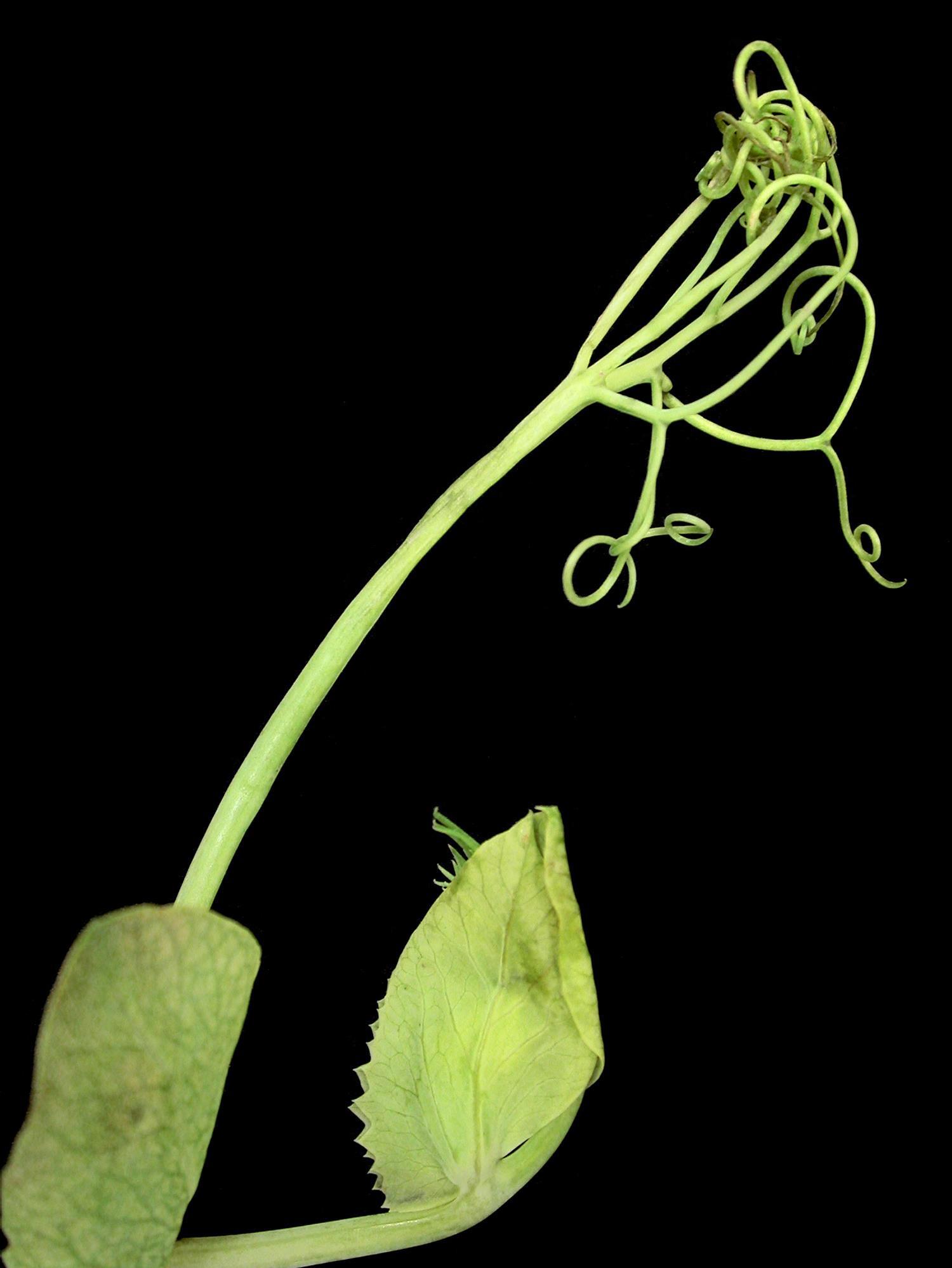 Description: La partie terminale d’un plant de pois vert montre une déformation des vrilles et un jaunissement entre les nervures des jeunes feuilles. Les dommages sont caractéristiques d’une phytotoxicité à l’herbicide glyphosate. Le précédent cultural était le maïs grain et fourrager dans lequel des applications de glyphosate ont eu lieu. Le semis de pois a eu lieu le 20 mai et le 16 juin des échantillons symptomatiques ont été acheminés au Laboratoire d’expertise et de diagnostic en phytoprotection du MAPAQ.