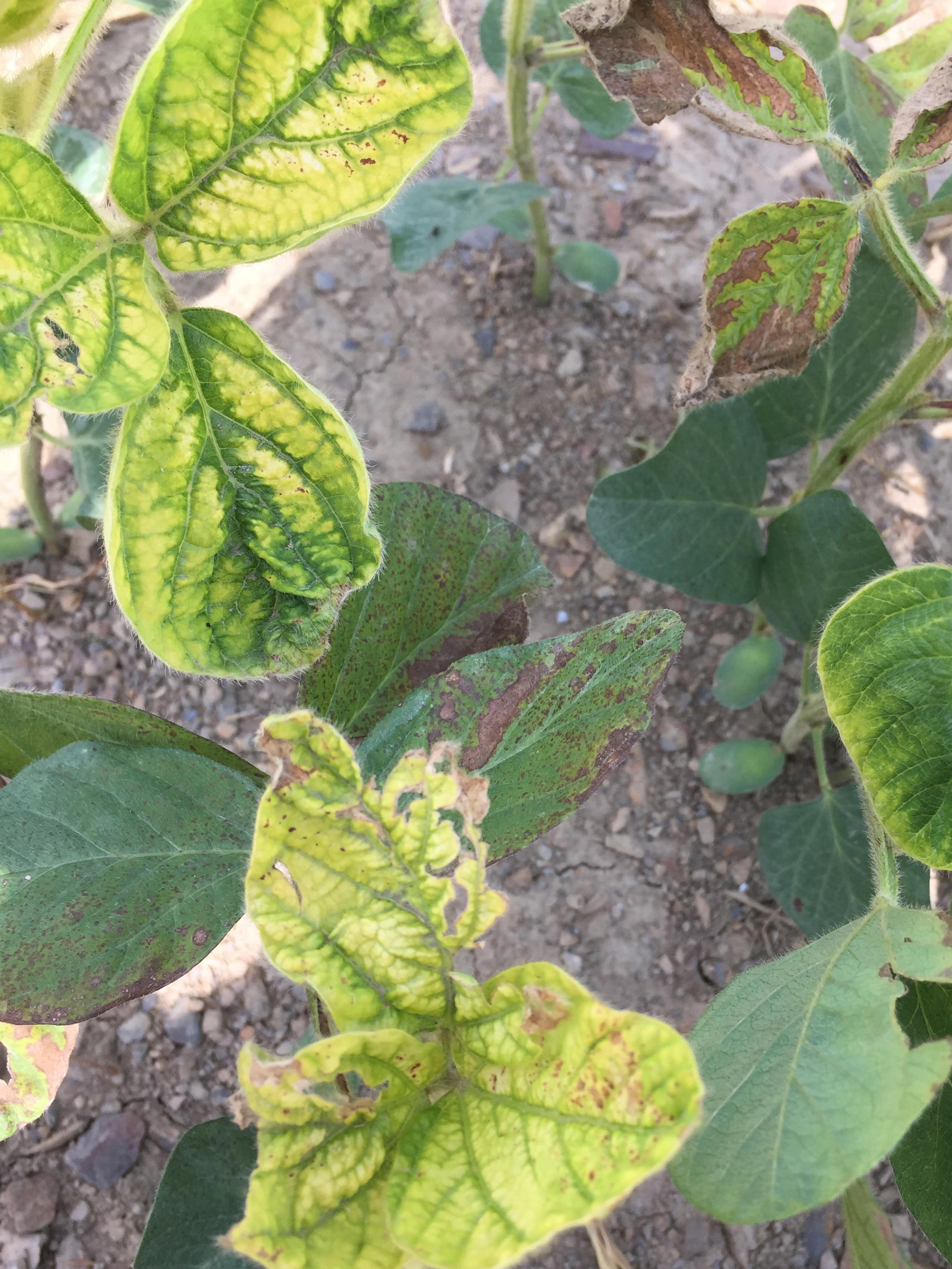 Description: Jaunissement à blanchiment internervaire, accompagné d’une brûlure des tissus, sur feuilles de plants de soya. Ces symptômes sont attribuables à l’application d’herbicides contenant des résidus de mésotrione (et d’atrazine). L’application de mésotrione dans une culture de soya peut occasionner d’importants dommages, des pertes de rendement voire la mort de la culture.