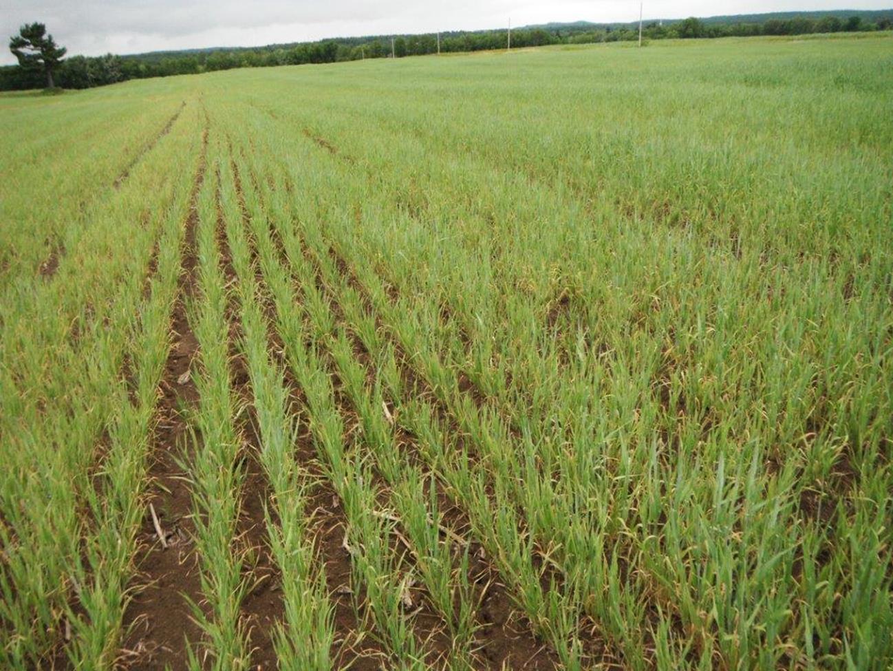 Description: Les feuilles de plants d’orge montrent du jaunissement à blanchissement des feuilles. Cette décoloration est attribuable à un résidu de l’herbicide CALLISTO (mésotrione). Typiquement, les plantes sensibles à la mésotrione présentent un blanchiment (ou un jaunissement) internervaire, suivi d’une nécrose des tissus. La mésotrione n'est pas homologuée dans la culture de l’orge. Cet herbicide peut occasionner d’importants dommages, des pertes de rendement voire la mort de la culture.