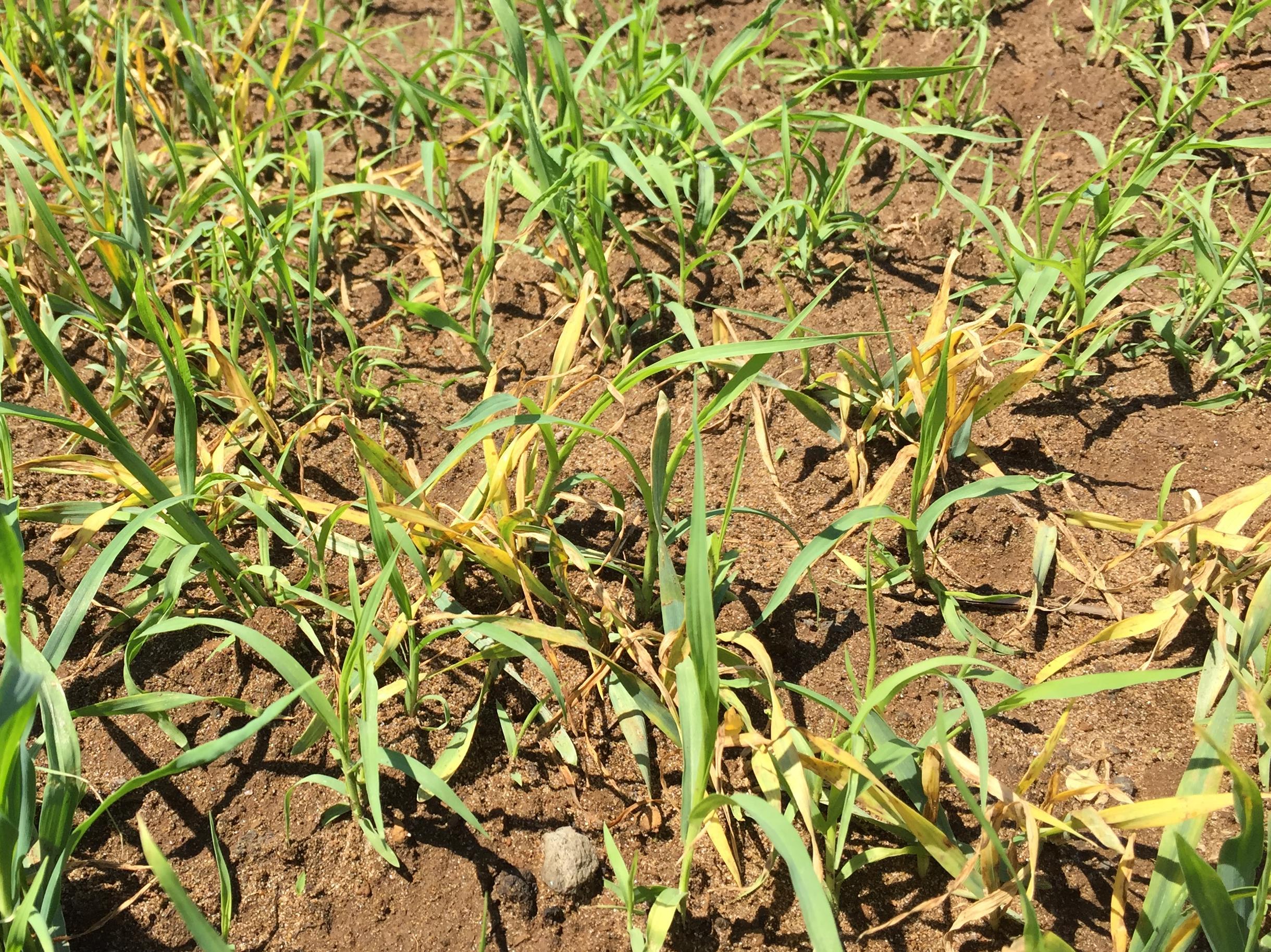 Description: Dans un champ d’orge, quelques rangs situés directement à côté d’un champ de quinoa présentent des plants dont les feuilles médianes et terminales sont jaunies et/ou brûlées. Le champ de quinoa voisin a reçu une application de l’herbicide ASSUREmdII (avec surfactant). Les symptômes dans le champ d’orge sont apparents environ deux semaines après la pulvérisation. Ceux-ci seraient attribuables à la dérive de l’herbicide, non homologué pour la culture d’orge.